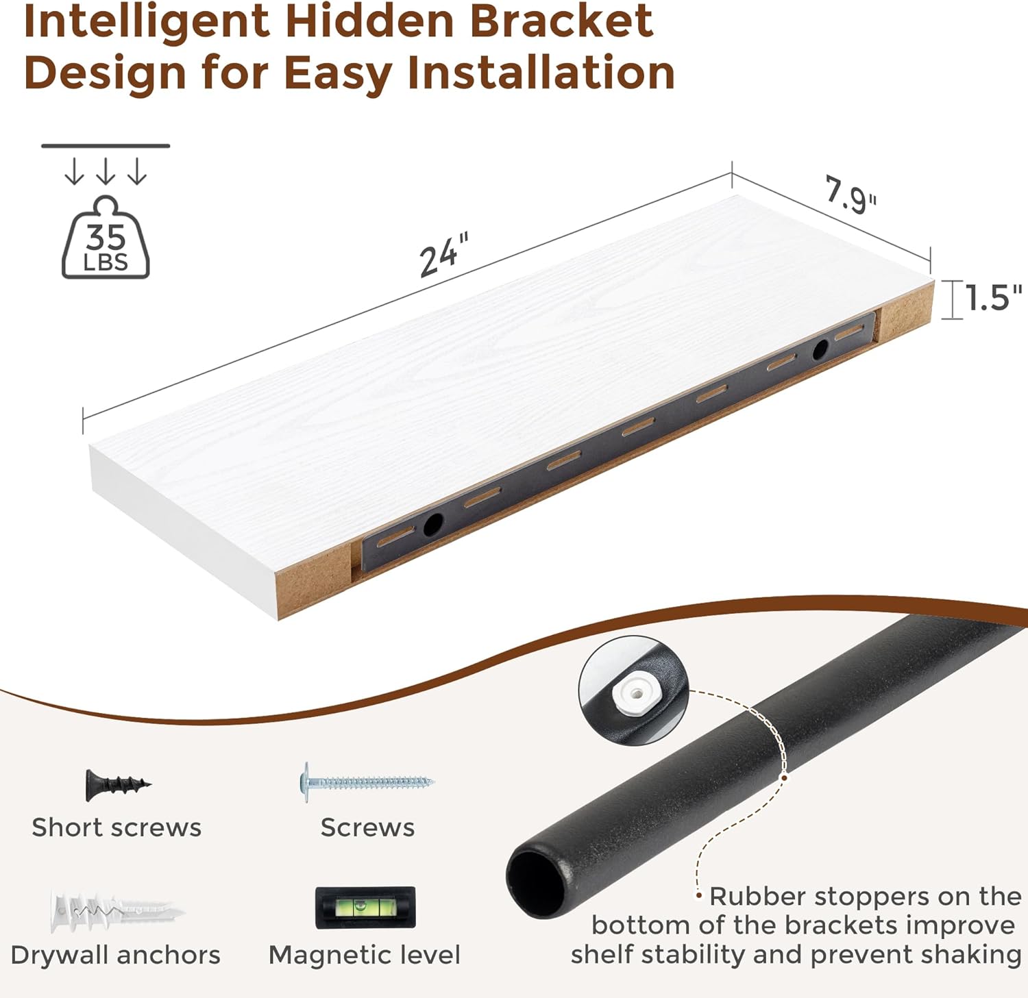 - 【Sturdy Support】Make the most of your wall space with our 24 x 8 inch white floating shelves for wall for room wall. At 1.5 inches thick, they offer sturdy support for your plants and decorative pieces. Each shelf can hold up to 30 lbs, ensuring your items never sag or fall.