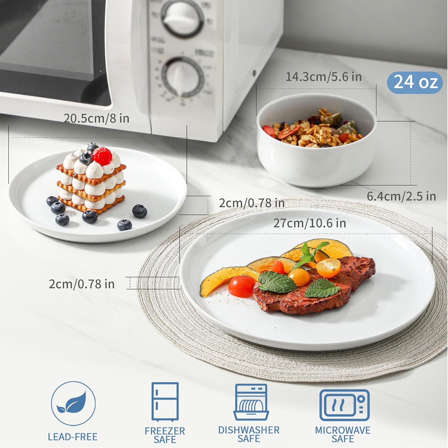 - 【WHAT YOU'LL RECEIVE】12 pieces dinnerware sets includes 4pcs x 10.5 inch dinner plates, 4pcs x 8 inch salad plates and 4pcs x 22 oz cereal bowls, to serve a variety of dishes, including dinner, dessert, salad, soup, and appetizers, catering to your diverse dining needs and perfect size for everyday use or any special occasions