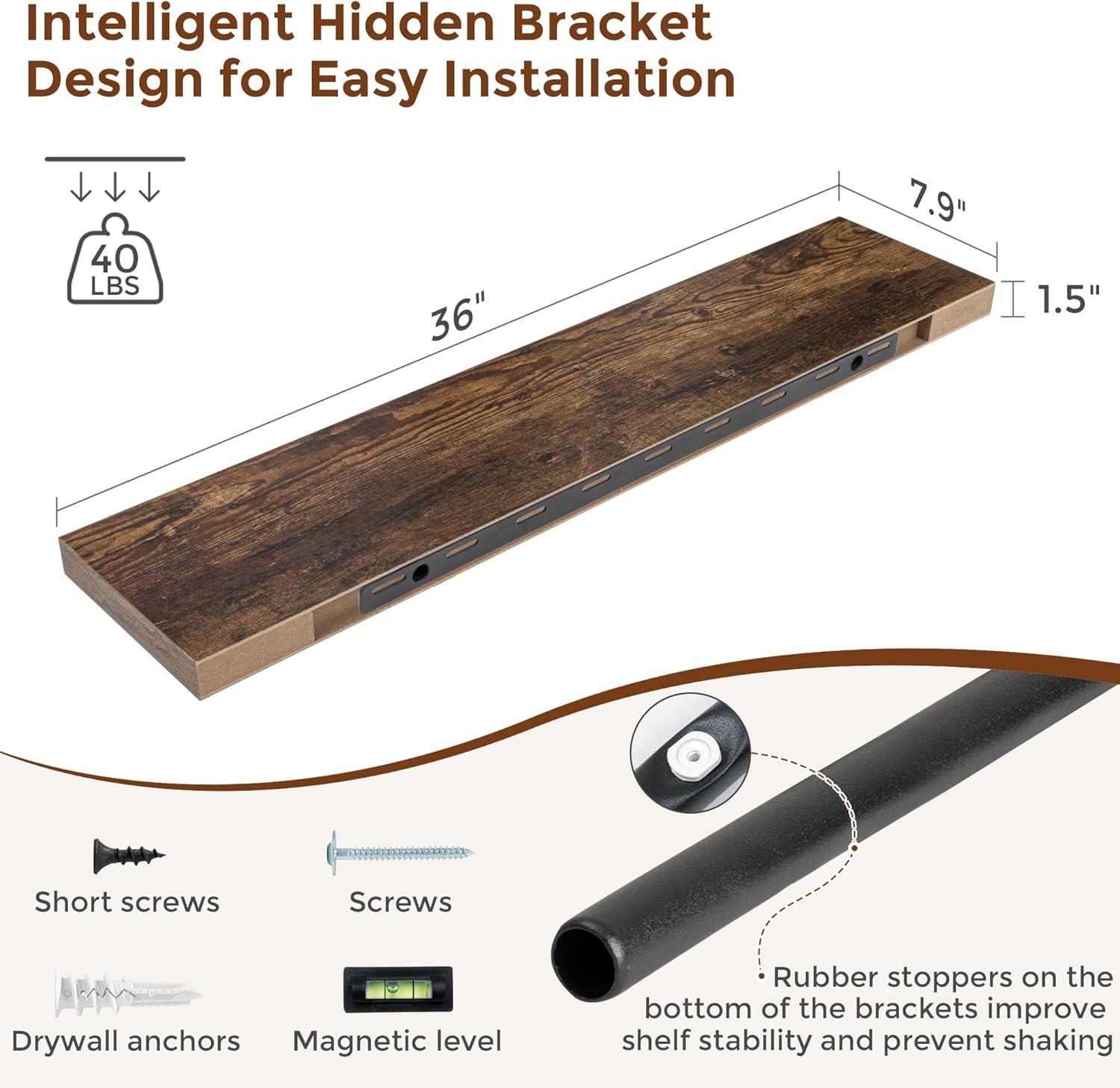 - 【Sturdy Support】Make the most of your wall space with our 36 x 8 inch brown floating shelves for wall for room wall. At 1.5 inches thick, they offer sturdy support for your plants and decorative pieces. Each shelf can hold up to 30 lbs, ensuring your items never sag or fall.
