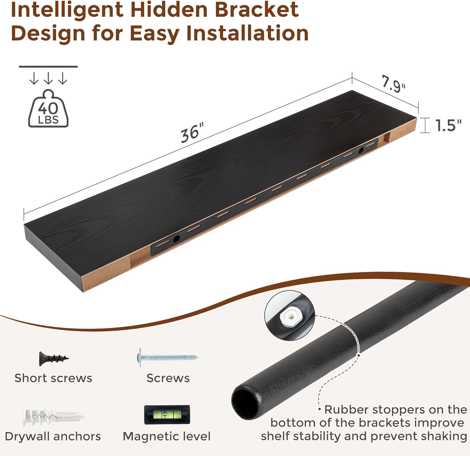- 【Sturdy Support】Make the most of your wall space with our 36 x 8 inch black floating shelves for wall for room wall. At 1.5 inches thick, they offer sturdy support for your plants and decorative pieces. Each shelf can hold up to 30 lbs, ensuring your items never sag or fall.