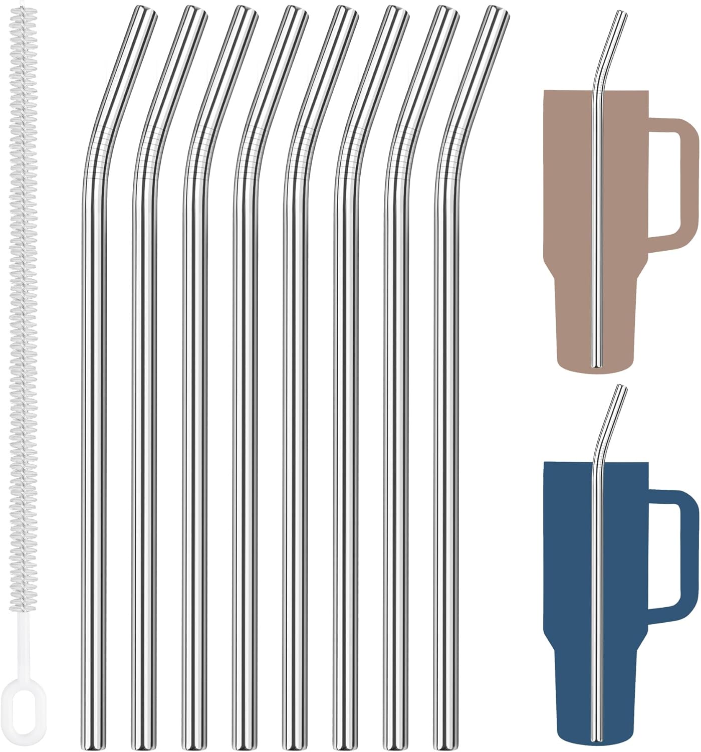 Tomorotec 8-Pack Bent Stainless Steel Straws for 40oz Stanley Tumblers, 12" Metal Straws for Stanley Cup with 1 Brush, Reusable Drinking Straws for Smoothies, Milkshakes, Dishwasher Safe (Silver)