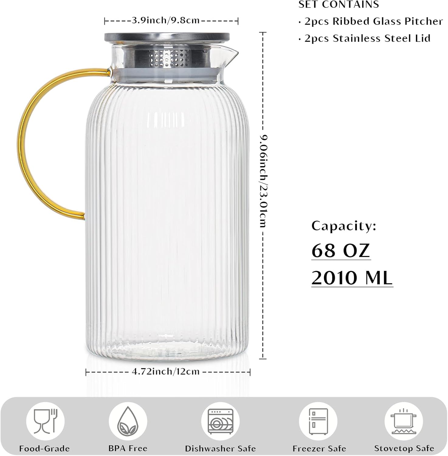 INSETLAN 68 Oz/2L Glass Pitcher with Lid and Spout, Ribbed Glass Jugs with Handle, Hot & Cold Water Pitcher for Iced Tea, Juice, Lemonade - Modern Glass Carafe for Fridge or Table (Pack of 2)
