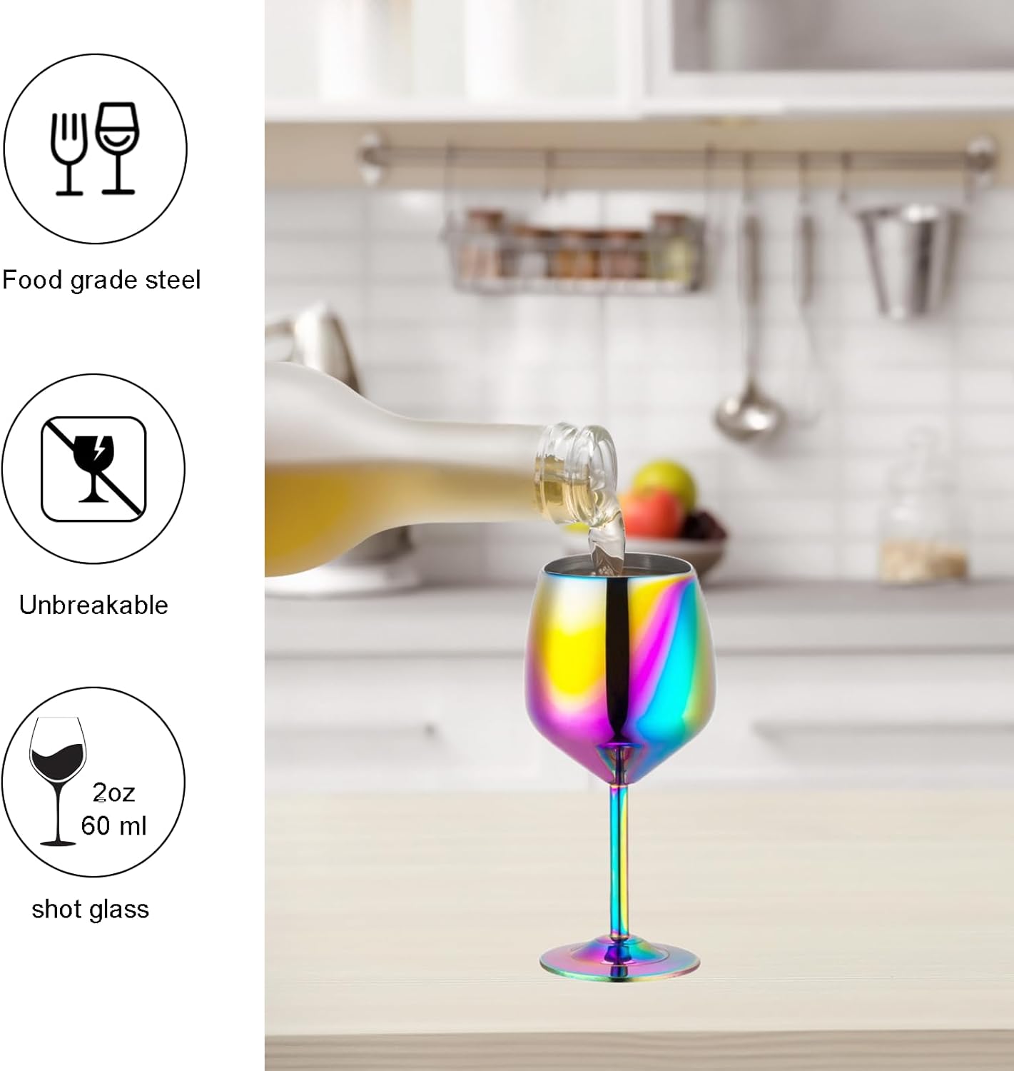 - Product size: A set of 2 high-quality stainless steel shot glasses, packaging size: 5.3×3.2×3.2 inches, 2 ounces capacity; Food grade safe materials, you can use them to taste all strong liquors or as a display; The wine glasses are easy to clean and can be used in a dishwasher, but we recommend hand washing them to better protect them (please consider the size before purchasing, as the actual product may be smaller than you imagine)