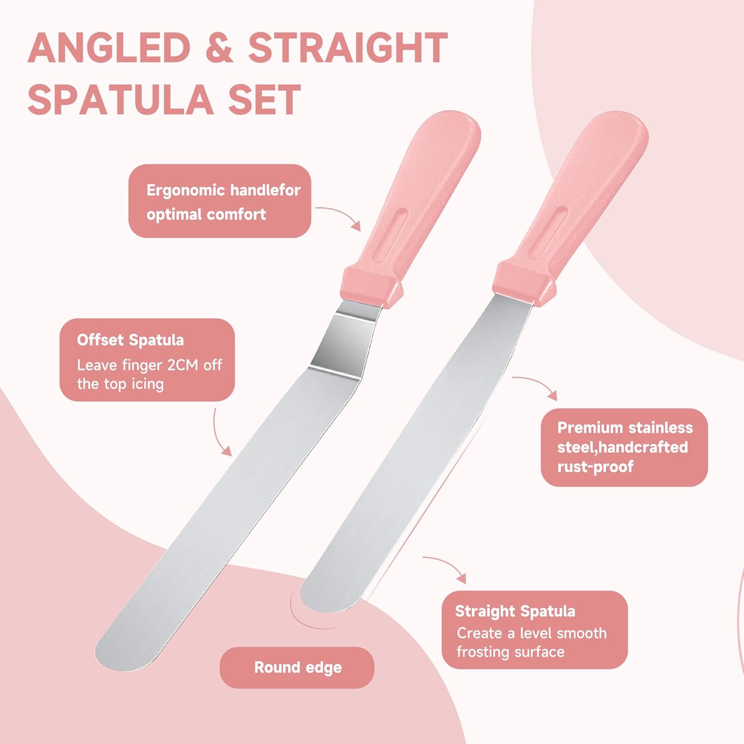 - Straight and Angled Frosting Spatulas: These high-quality stainless steel frosting spatulas make it easy to even out frosting and work on layered cakes. With a 12.5-inch angled spatula and a 10.6-inch straight spatula, you can create even crumb layers and perfect surfaces.3 Edges of Cake Scrapers: This cake decorating set includes 3 different icing comb scrapers, so you can make various designs on your cake. With one rounded scraper, one straight scraper, and one toothed scraper.