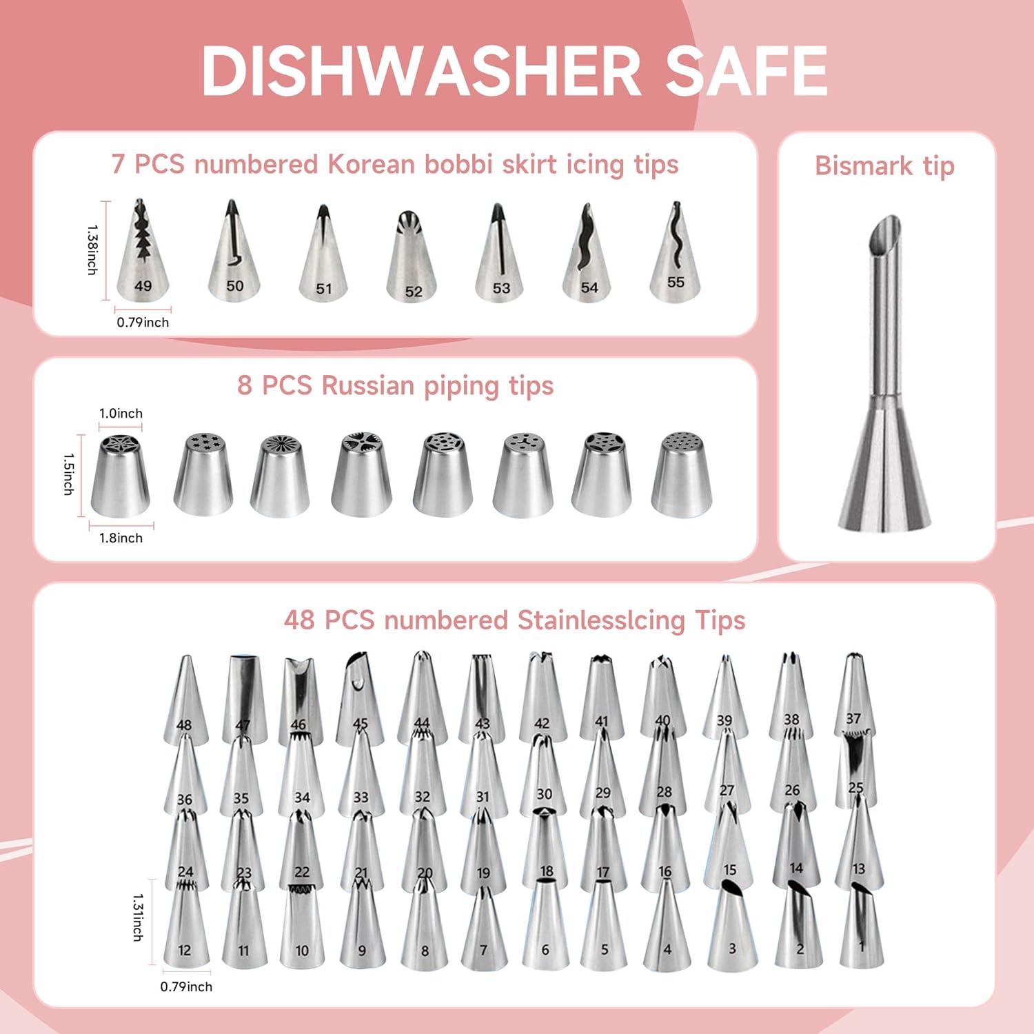 - Piping Bags and Tips Set: Includes 64 numbered icing piping tips, 30 disposable & 2 reusable 12” frosting pasty bags. Allow you to create a variety of designs, including simple dots and lines as well as intricate flowers and leaves. The included coupler makes changing tips on your piping bags a breeze without emptying the bag or creating any mess.