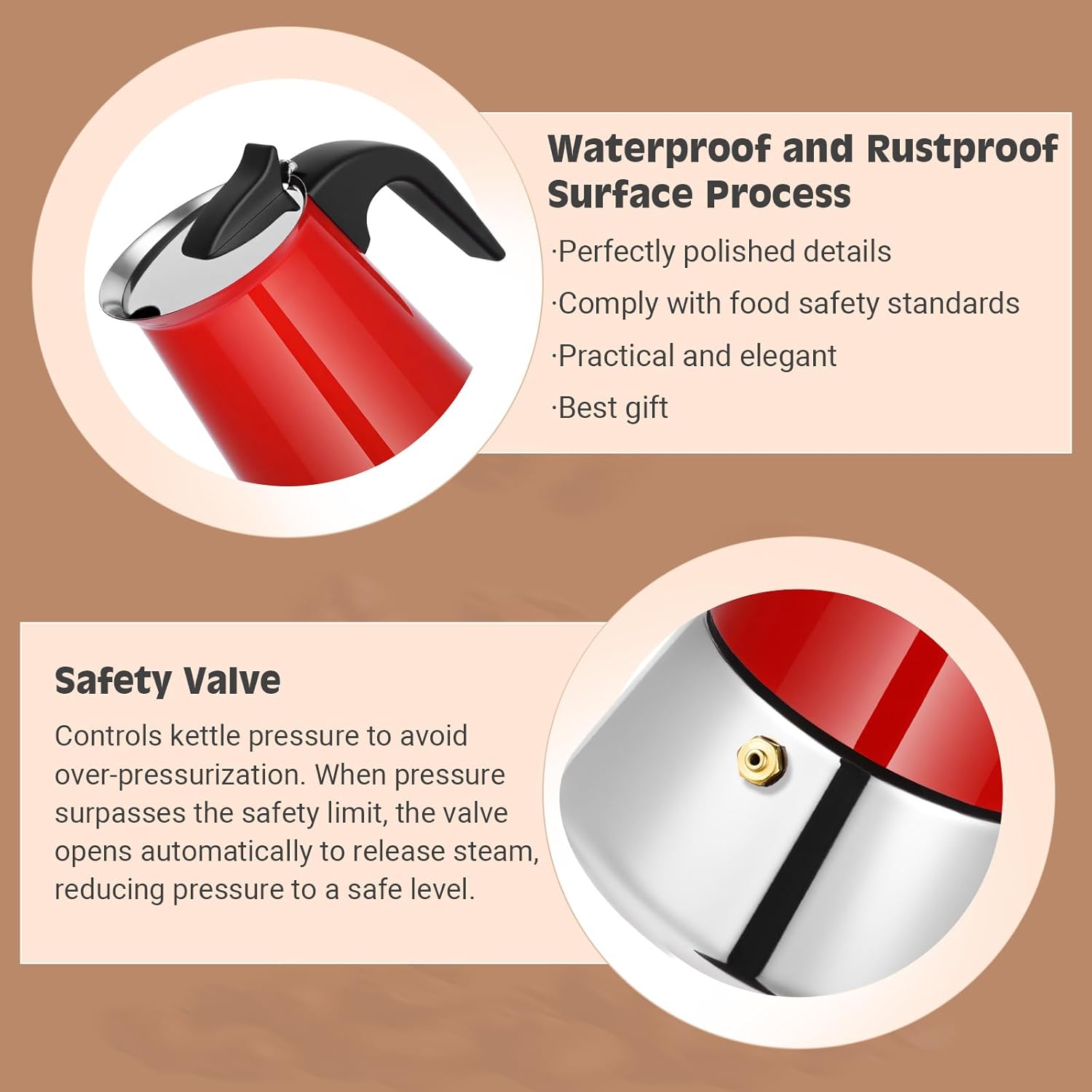 Moka Pot, 6 Cups (10.6 oz) Stovetop Espresso Maker, 304 Stainless Steel Moka Pot, Induction Compatible, Red