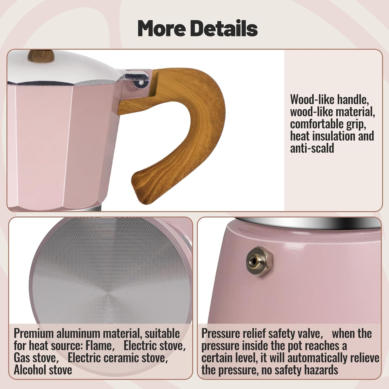 3 Cup Aluminum Moka Pot Classic Stovetop Espresso Coffee Maker 150ml 5oz Coffeemaker Percolator Mocha Pot Greca Coffee Maker Cafe Makers for Italian and Cuban Café Brewing Pink