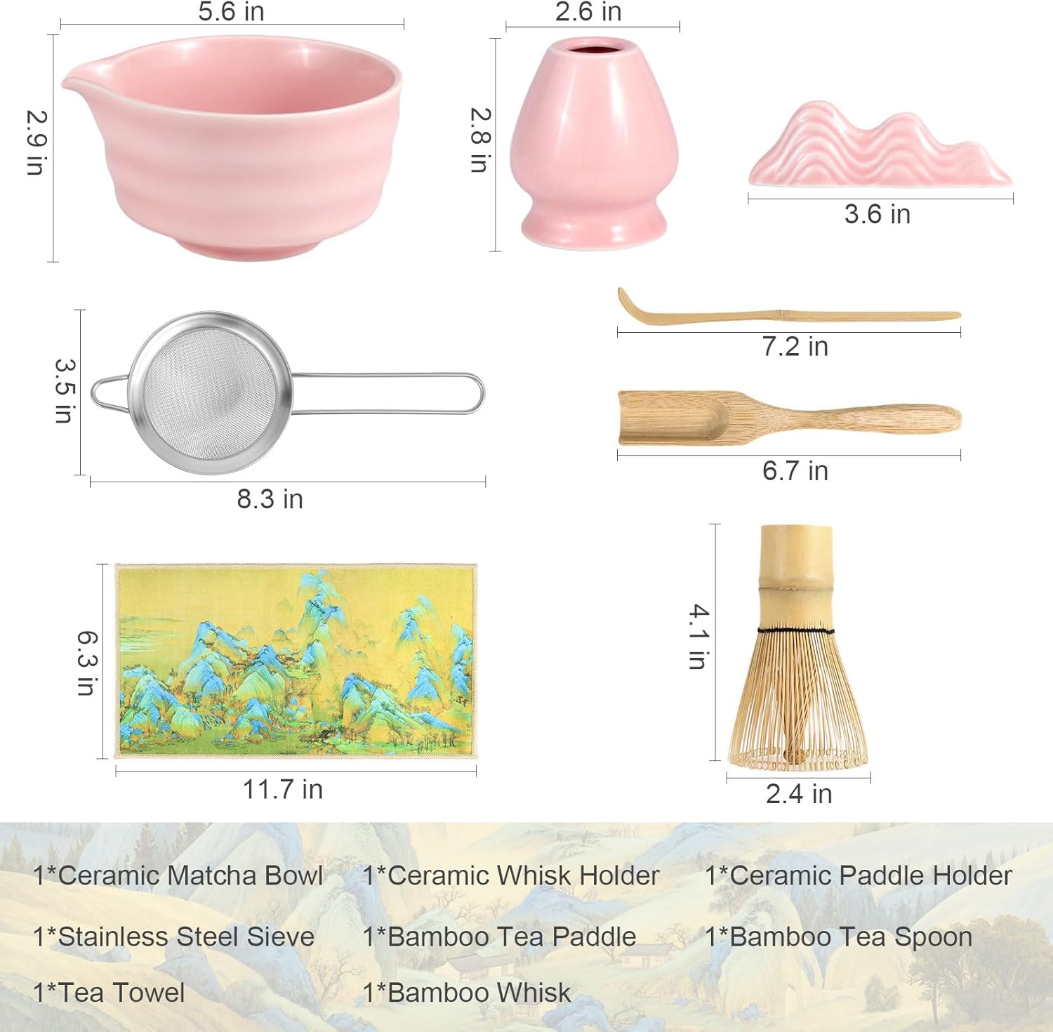 - All-in-One Matcha Whisk Set: This 8-piece matcha set includes everything you need for a perfect matcha experience: bamboo matcha whisk (chasen), matcha scoop (chashaku), bamboo tea paddle, ceramic matcha bowl with spout, whisk holder, stainless steel sifter, tea towel, and tea paddle holder. Designed for both traditional tea ceremonies and modern matcha making, it’s perfect for matcha lovers and beginners.