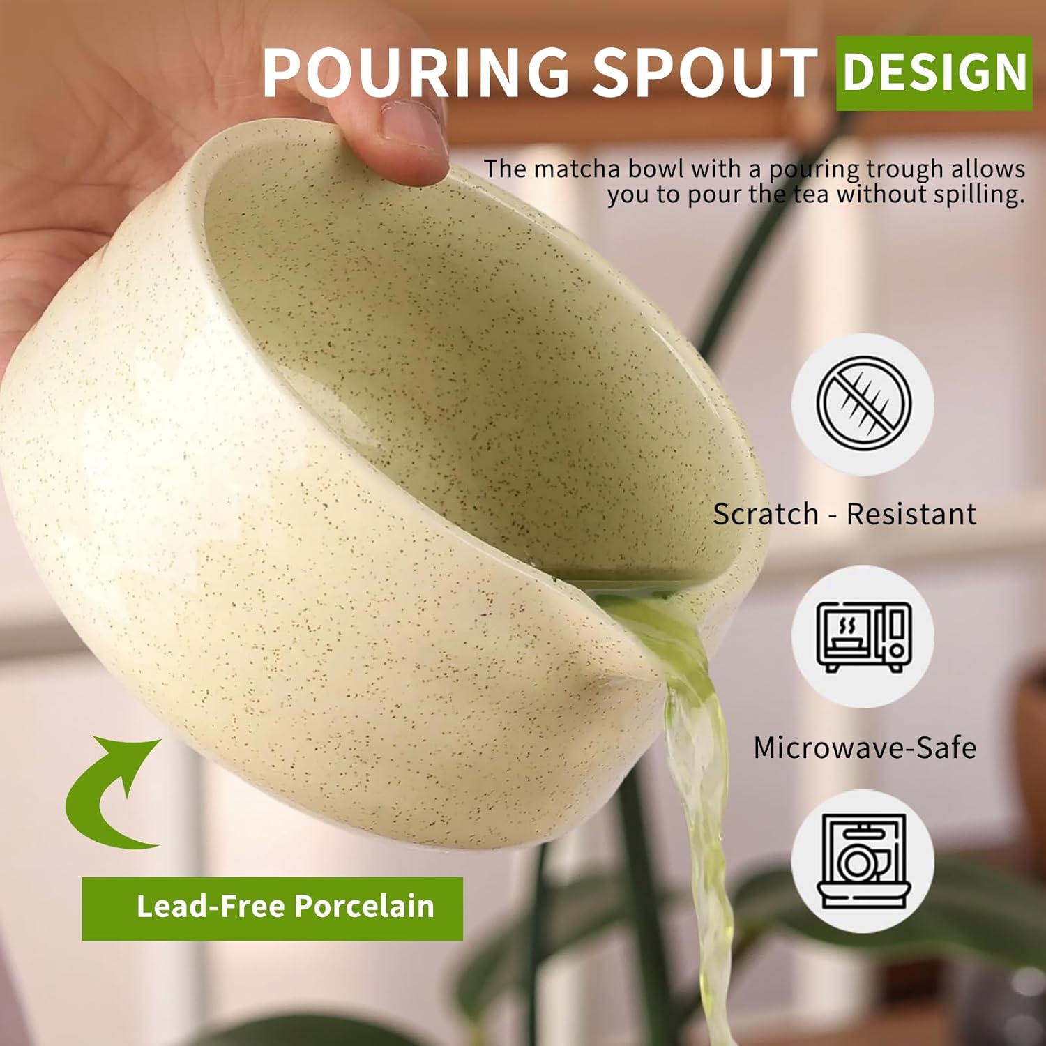 - Complete Kit: Includes: Ceramic matcha bowl with spout Handmade bamboo whisk + ceramic whisk holder Stainless steel sifter, bamboo scoop, ceramic scoop stand, absorbent cloth.