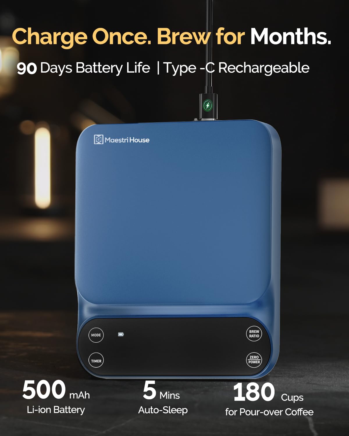 Maestri House S3 Coffee Scale with Timer, 3kg/0.1g Rechargeable Digital Scale, 3 Brew Modes, Adjustable Ratios & Flow Rate Display, Barista-Grade for Pour-Over, Espresso, French Press – Blue