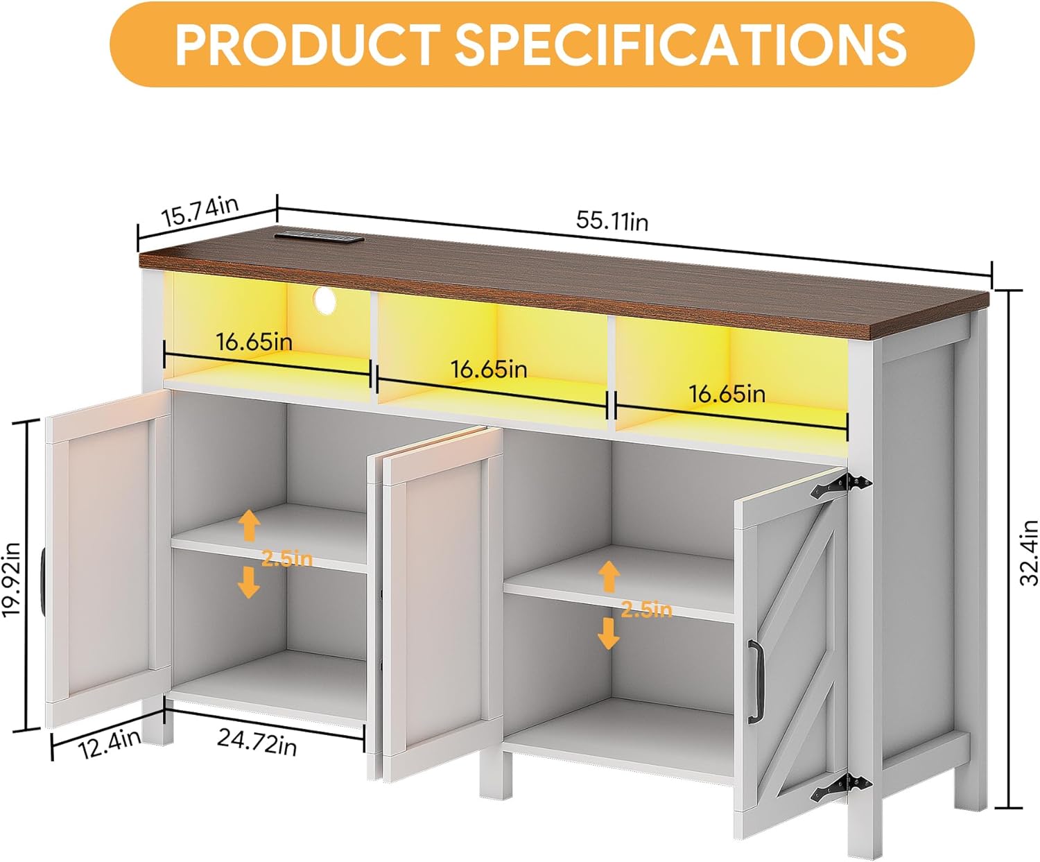 Buffet Sideboard with Storage with Power Outlets & LED Light 4 Doors, 55'' Large Farmhouse Kitchen Storage Cabinet Wood Coffee Bar Cabinet Buffet Table for Kitchen, Dining Room, Entryway