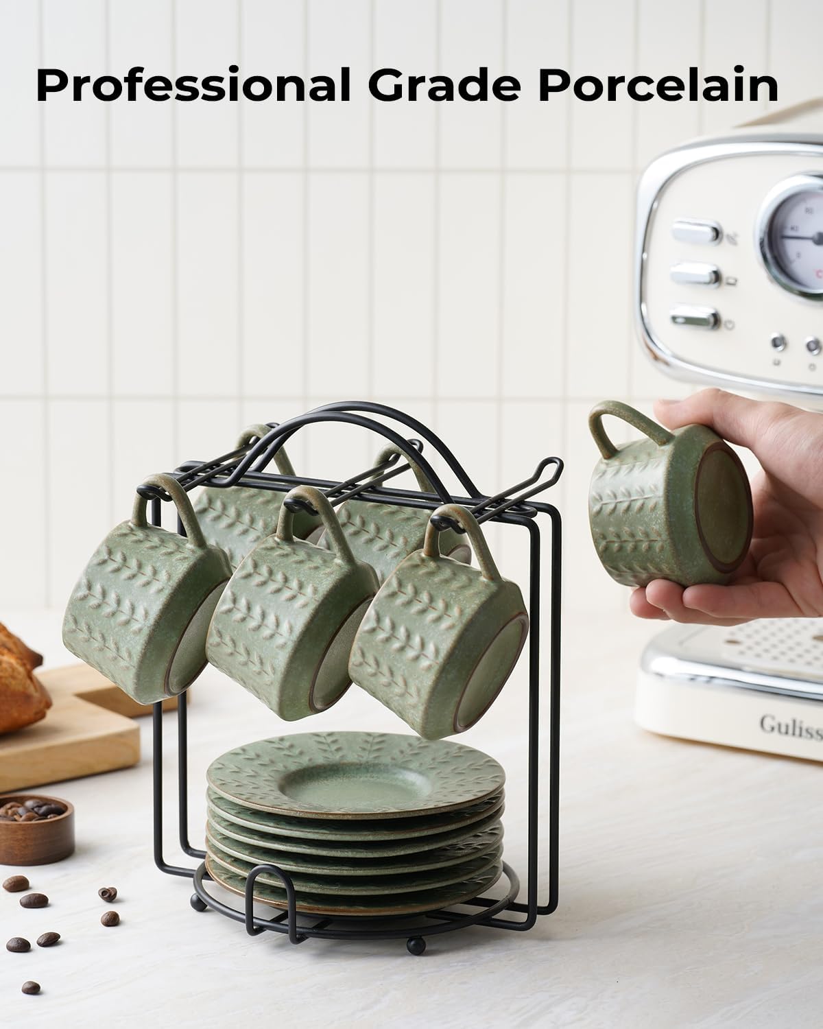 - Espresso Cup Set: This espresso cups set of 6 includes cups, saucers, and an iron rack, creating a tidy, stylish coffee station. It keeps your countertop organized with seamless storage and elegant presentation — ideal for any kitchen or espresso bar
