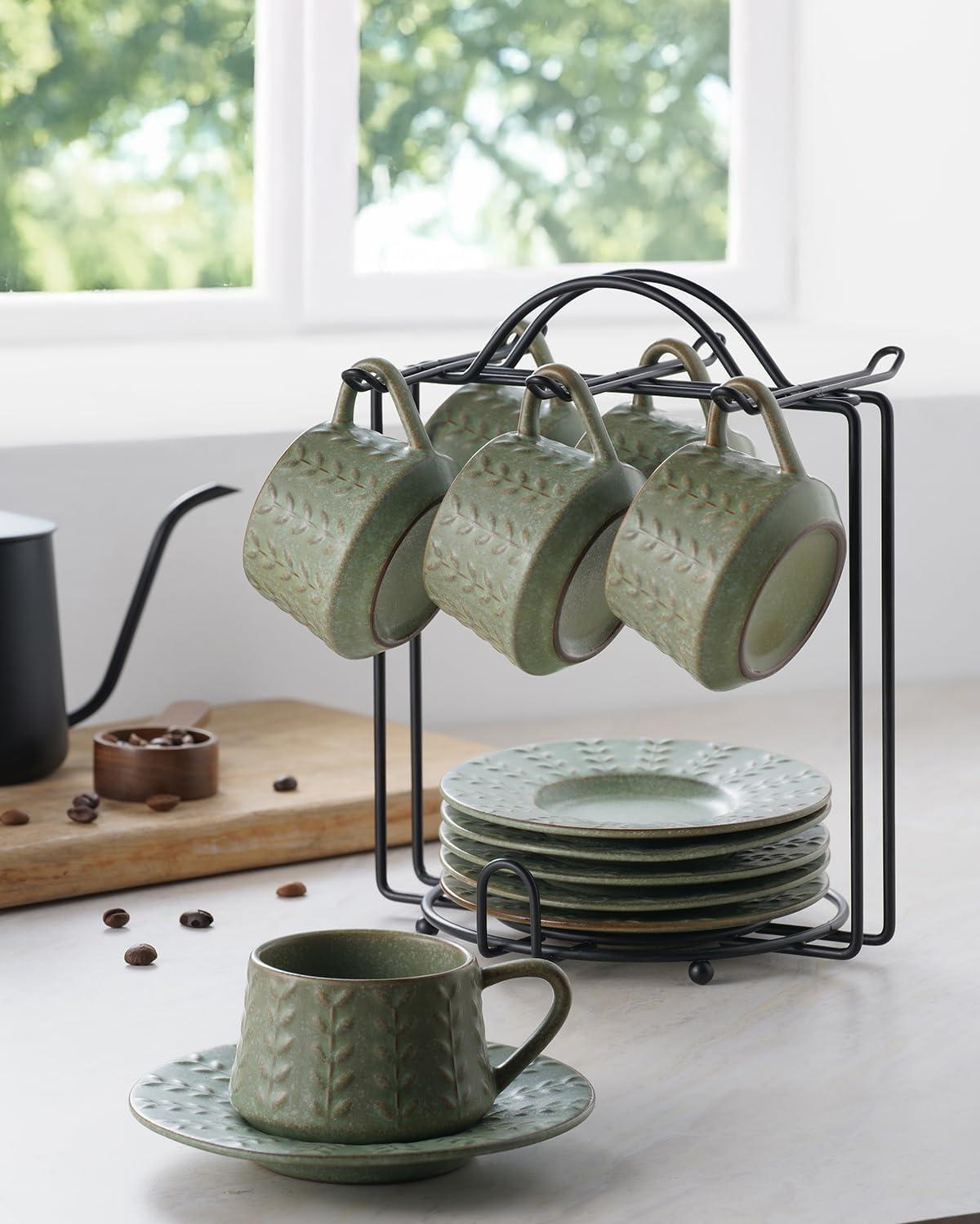 - Space-Saving: All pieces are neatly organized on a stylish iron rack, which securely holds the espresso cups and saucers in place. The robust design helps minimize movement during cleaning or handling, offering a clean, display-worthy look