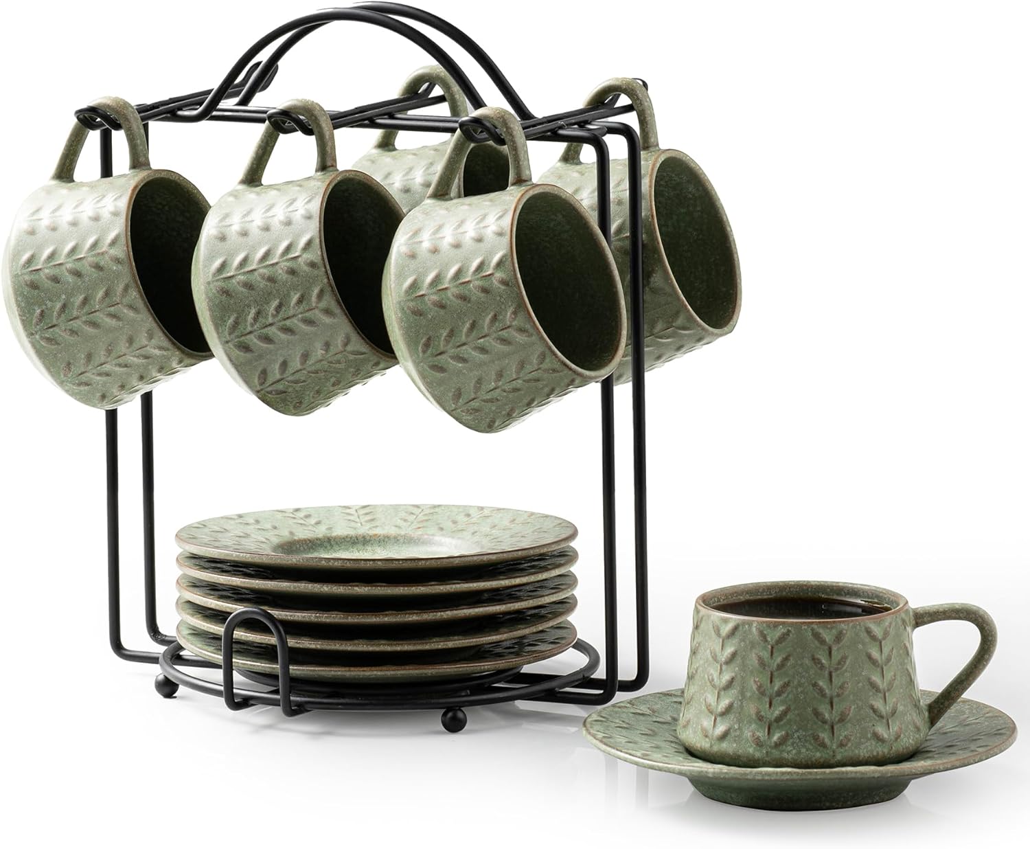 Espresso Cups Set of 6, 4 oz Demitasse Cups with Saucer and Metal Stand Small Coffee Cup Set, Porcelain Cappuccino Cups for Latte, Cafe Mocha and Tea, Green