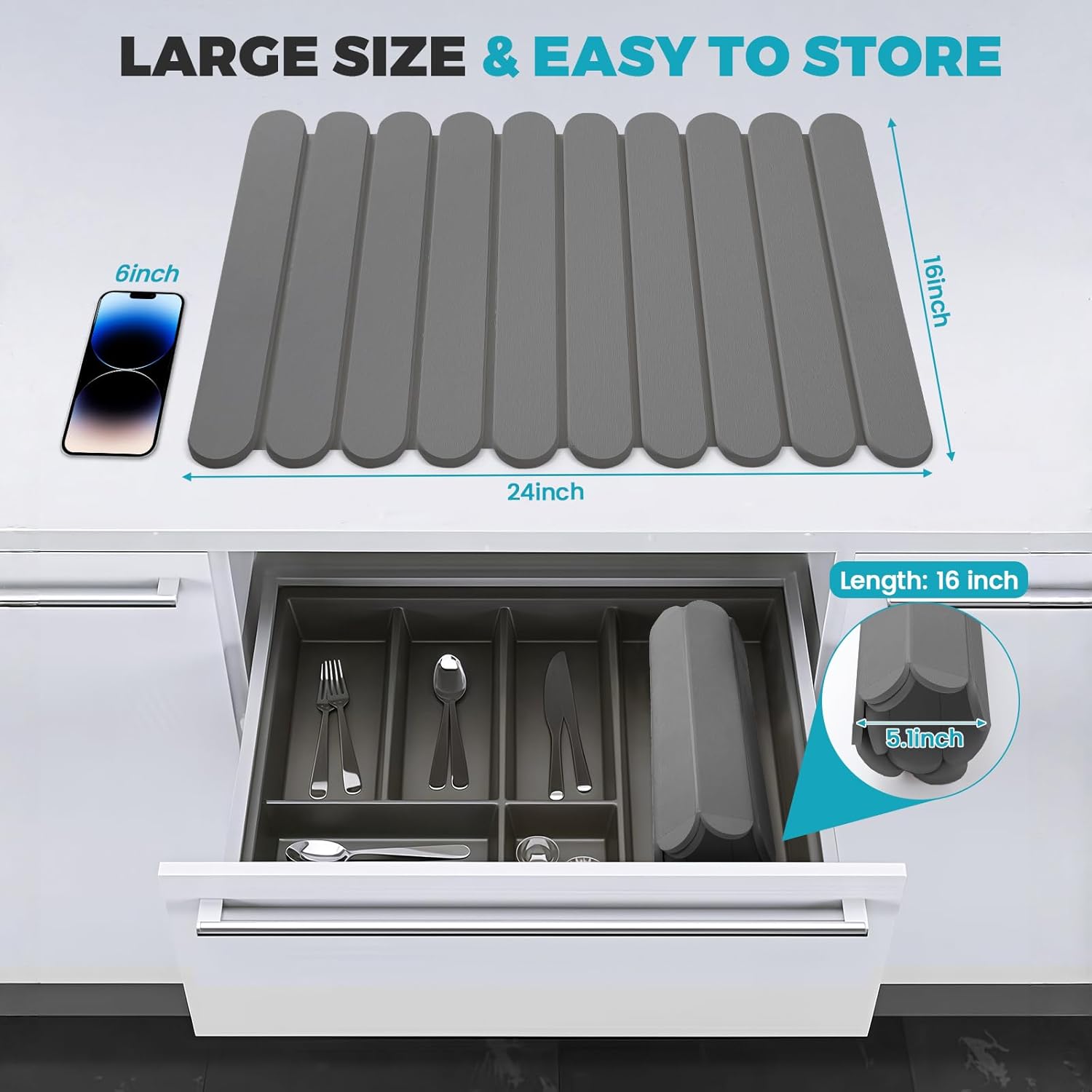 - Collapsible and Space-Saving: Measuring 24"(L)x16"(W) when unfolded, this collapsible stone drying mat offers ample space for your dishes. When not in use, easily store it in drawers or kitchen cabinets, maximizing your kitchen's organization