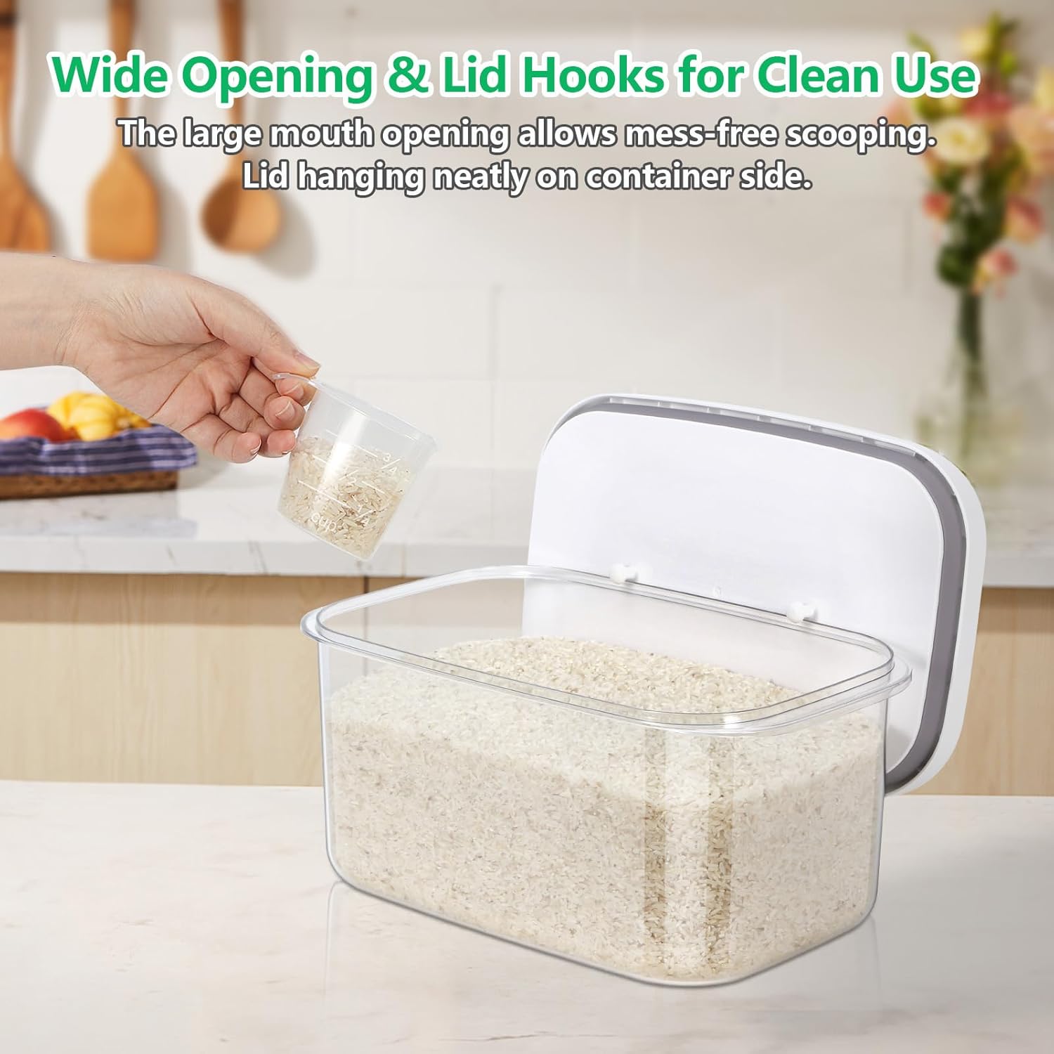 - VERSATILE RICE STORAGE CONTAINER: This rice container with airtight lid is great for storing bulk rice, flour, cereal, beans, oats, nuts, pet food and much more. Crystal clear container allow to see the food at a glance and remind you to refill. Plus, the sleek see-through design makes it look more visually appealing on your kitchen cabinet