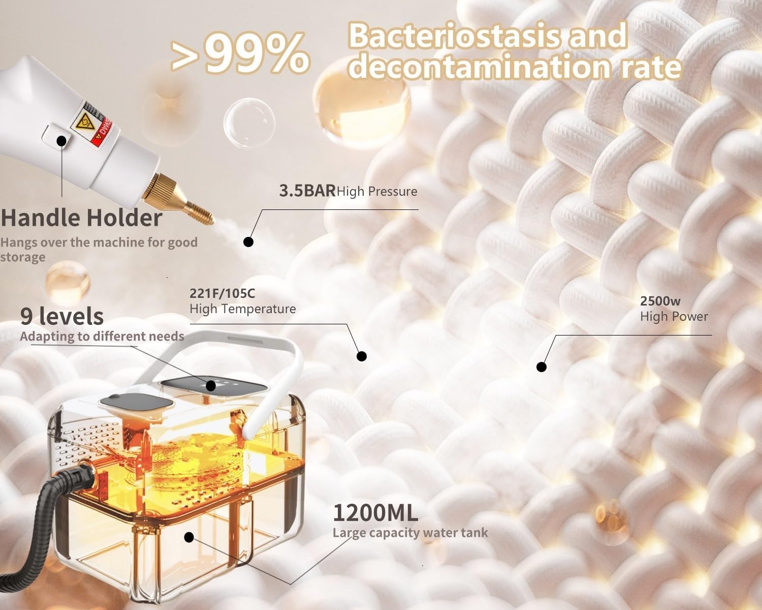 - Powerful Pressurized Steam Cleaner - Foandbevi handheld steam cleaner features 2500W power, quickly generating steam up to 221℉(105℃) 3.5 Bar in 15s. No need to wait to deeply clean and eliminate grease, grime, dust, and stains from all surfaces