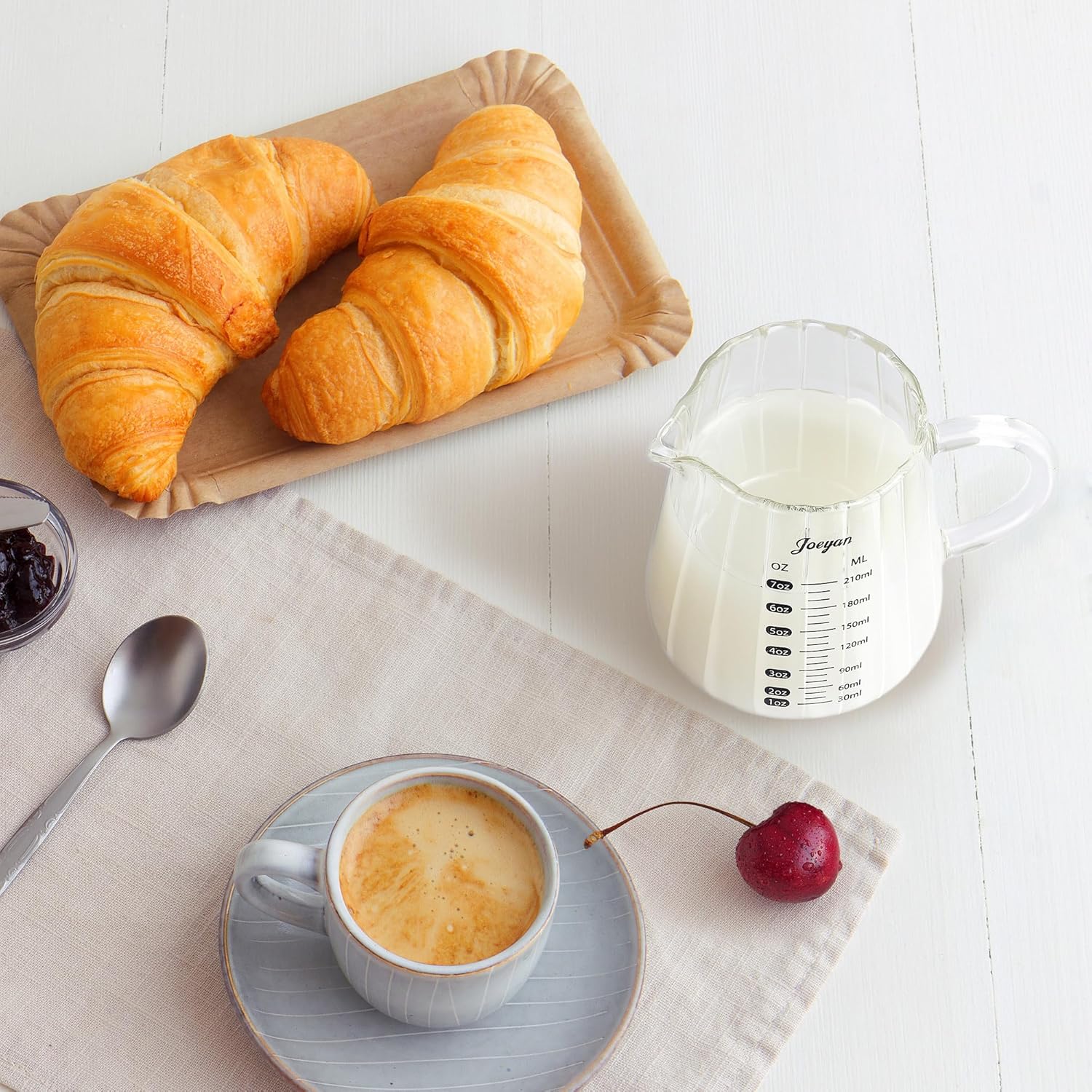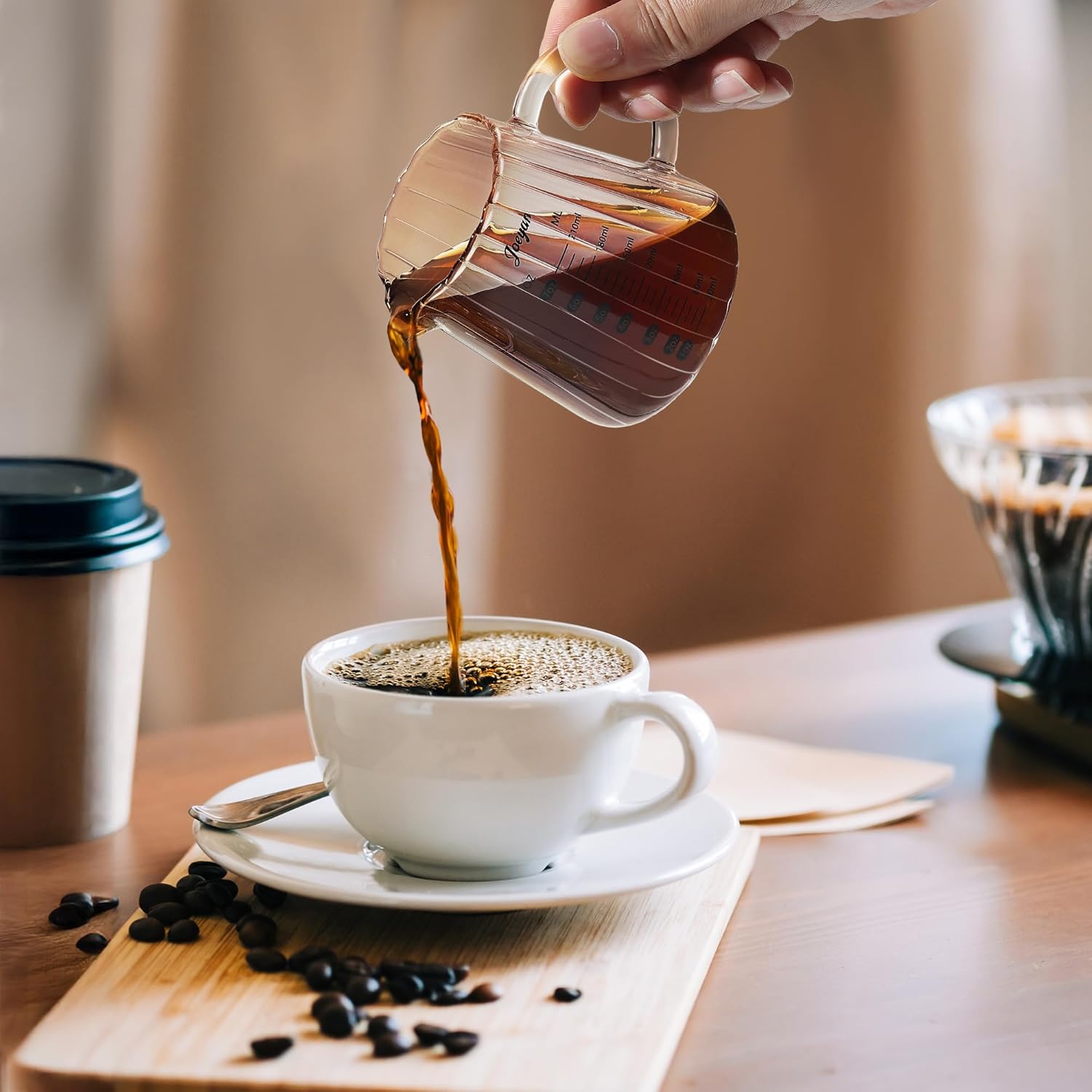 Joeyan 7 oz Glass Measuring Cups with Spout,Borosilicate Large Glass Triple Pitcher with Scale,Origami Style Espresso Shot Glasses with Wood Handle for Coffee Milk