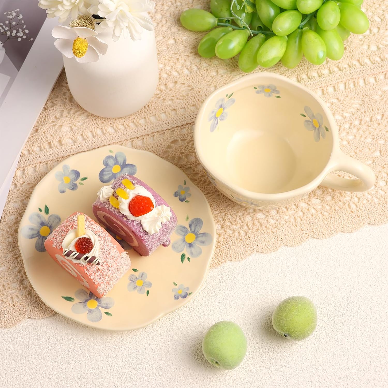 Cappuccino Cups with Saucers 8 oz Latte Art Cup Ceramics Coffee Mugs Irregular Aesthetic Flower Cups for Espresso, Double Shot, Americano, Latte, Tea - Microwave and Dishwasher Safe (Blue Flowers)