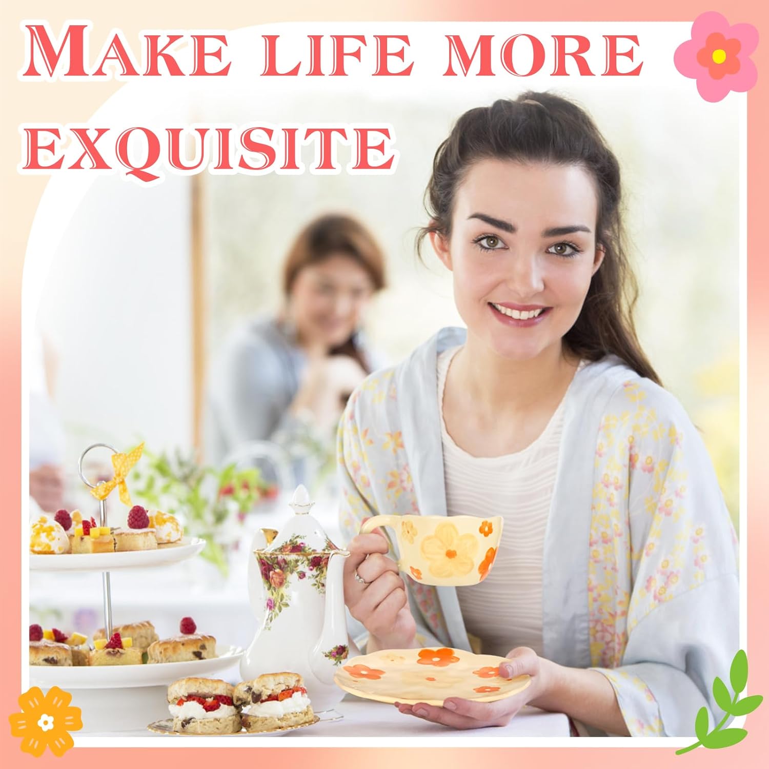 Cappuccino Cups with Saucers 8 oz Latte Art Cup Ceramics Coffee Mugs Irregular Aesthetic Flower Cups for Espresso, Double Shot, Americano, Latte, Tea - Microwave and Dishwasher Safe (Orange Flowers)
