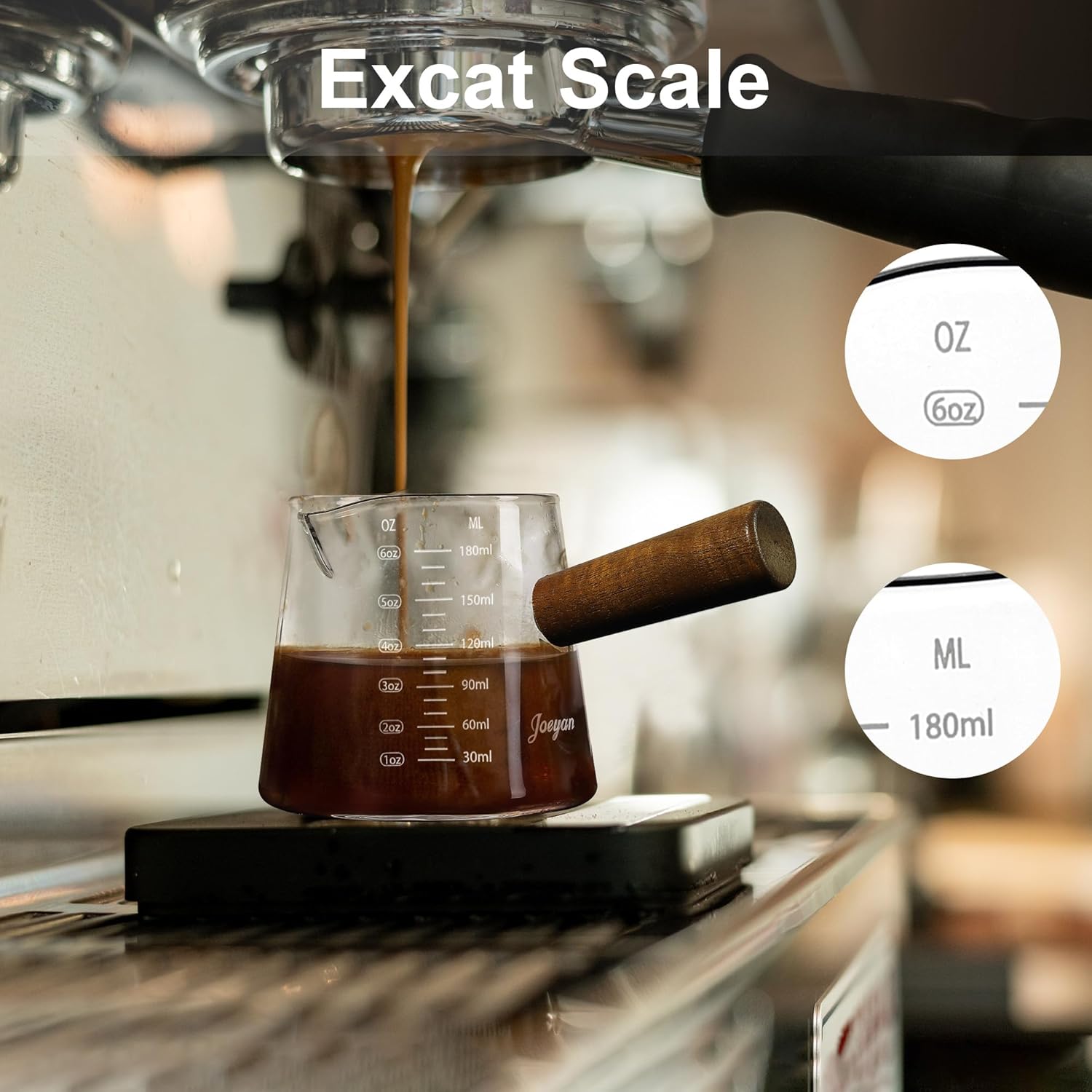 Joeyan 6 oz Glass Measuring Cup with Double Spouts,Borosilicate Espresso Shot Glasses with Wooden Handle,Claer Measuring Triple Milk Frothing Pitcher for Coffee Tea