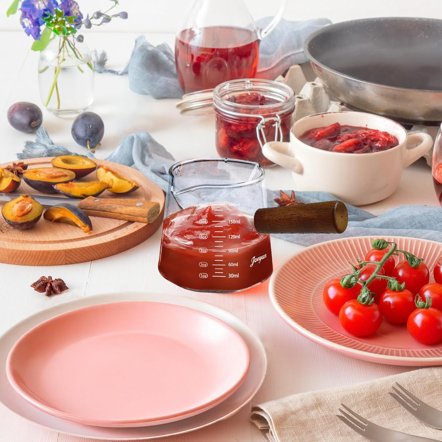 - Secure Wooden Handle and Double Scale Design: Our glass measuring cup features a heat-resistant ergonomic wooden handle that provides a secure, comfortable grip—perfect for pouring hot coffee, espresso, or melted butter without burning your hands, it ensures stability and control. The measuring cup has two clear graduations in ounces and milliliters so you know exactly how much you need for each step.