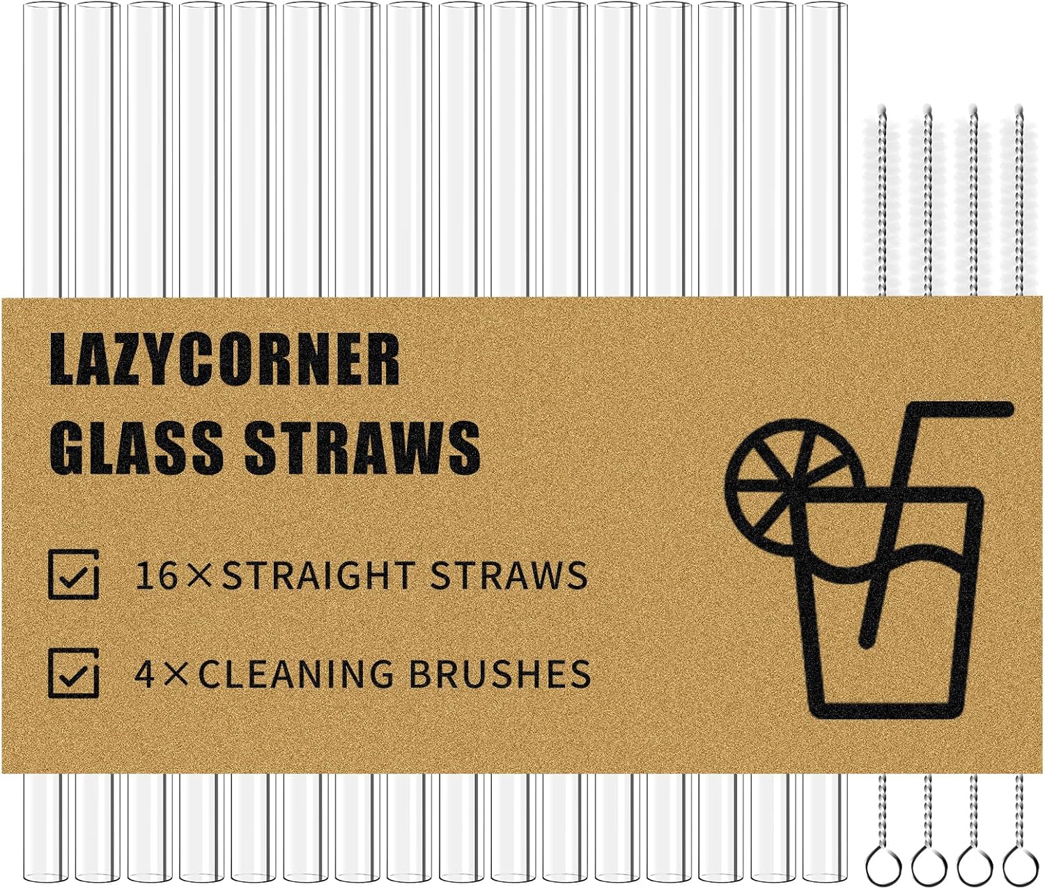 Lazycorner Reusable Glass Straws Set 16 Pcs 8.5''x 10MM Straight Clear Glass Drinking Straws, Set of 16 with 4 Cleaning Brushes. Reusable Straws Perfect For Smoothies, Tea, Juice-Clear Cocktail.