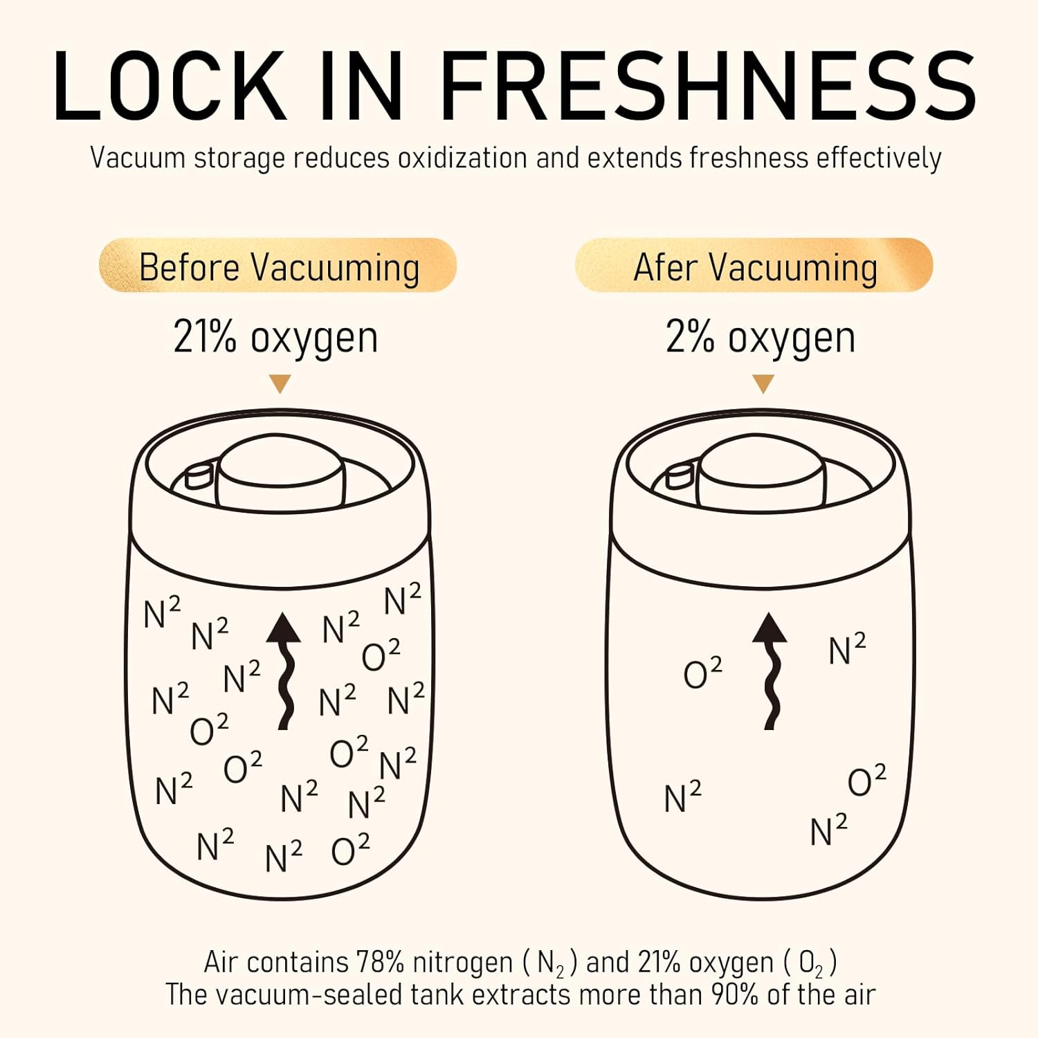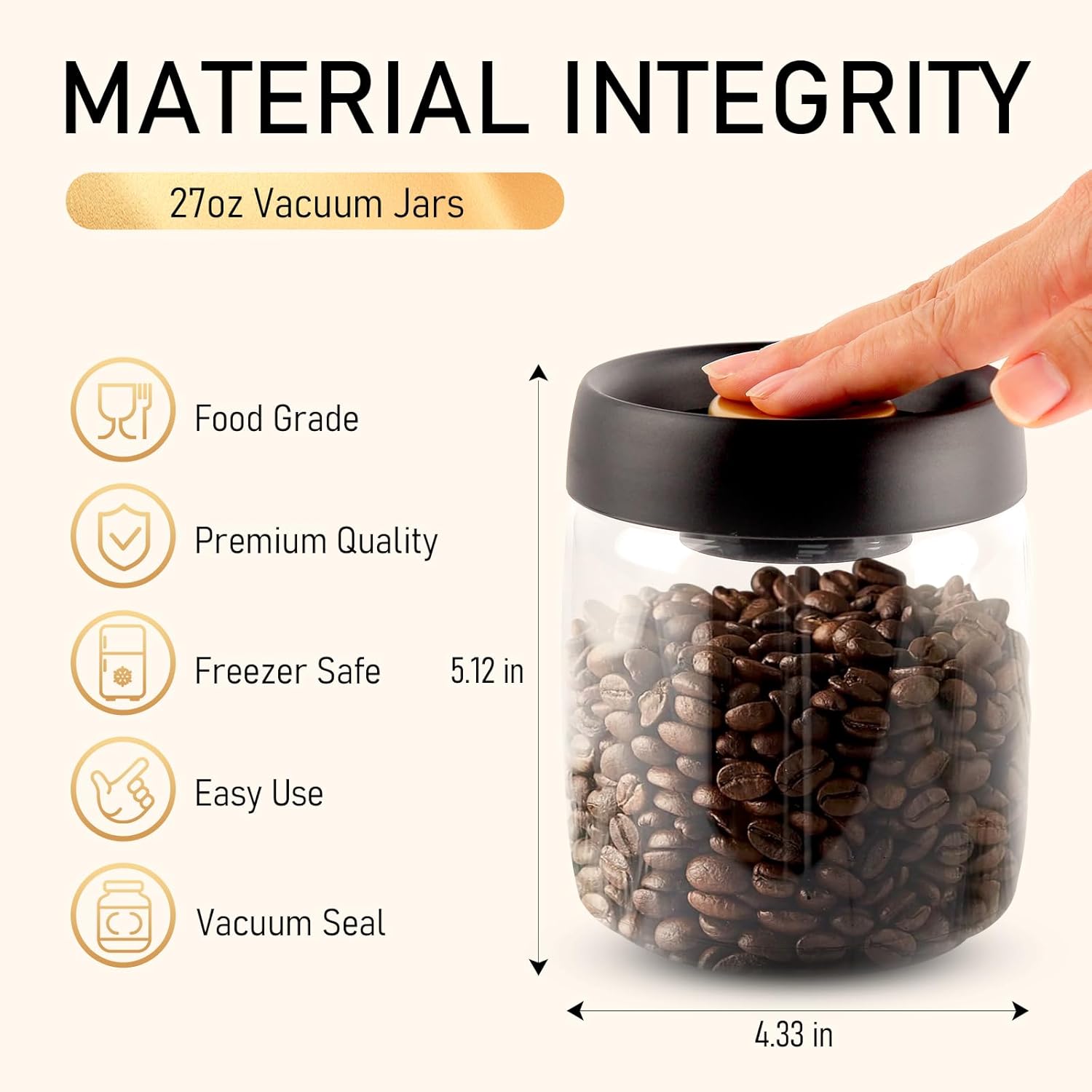 - Press-Down Vacuum Airtight Lid: Our vacuum sealed jars come with an airtight lid with a button that removes air at the touch of a button, preventing the food inside the jar from oxidizing, which can extend freshness up to five times longer. The practical push-on lid design allows for a simple yet effective vacuum seal, minimizing air exposure and thus extending the shelf life of the contents