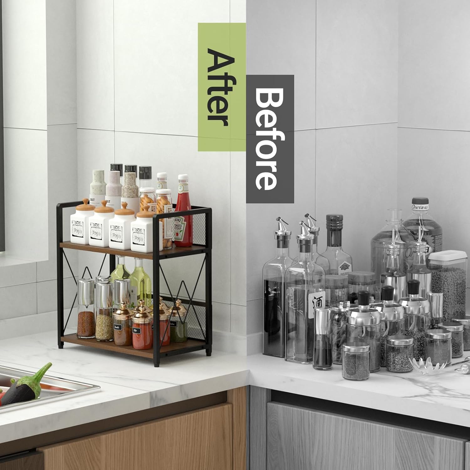 - Efficient Space-Saving Design: The two-tier structure of this kitchen counter organizer provides ample storage for all your coffee bar essentials and spice shelf items, making it a versatile addition to any countertop, whether as a coffee station organizer or a general countertop storage solution
