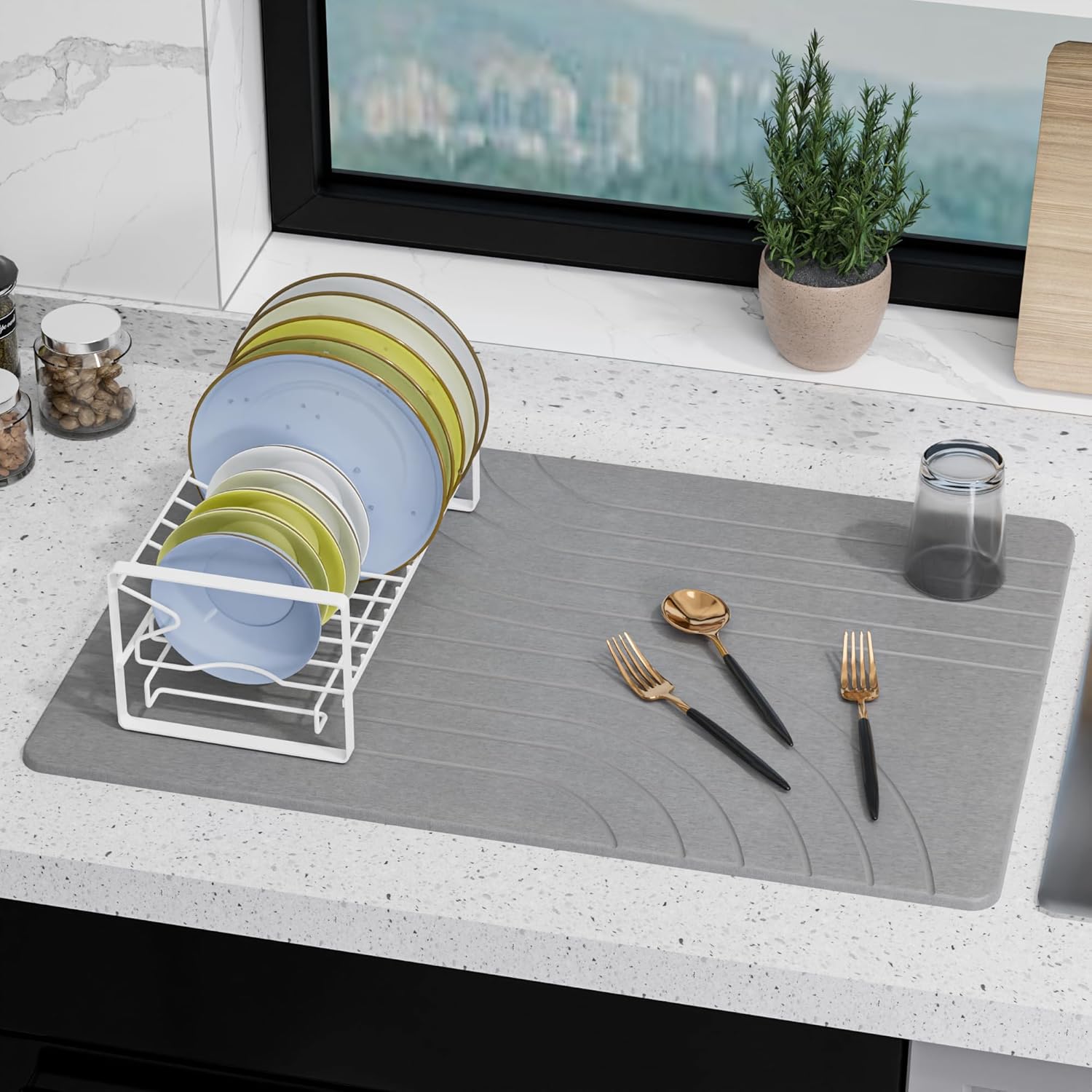 - [ECO-CONSCIOUS KITCHEN ESSENTIAL]: The stone drying mat for kitchen counter handcrafted with non-toxic diatomaceous earth and upcycled paper, designed for health-conscious homes. Drying matt kitchen counter combines sustainable with water-absorbing functionality, wrapped in minimalist aesthetics that align with your health life.