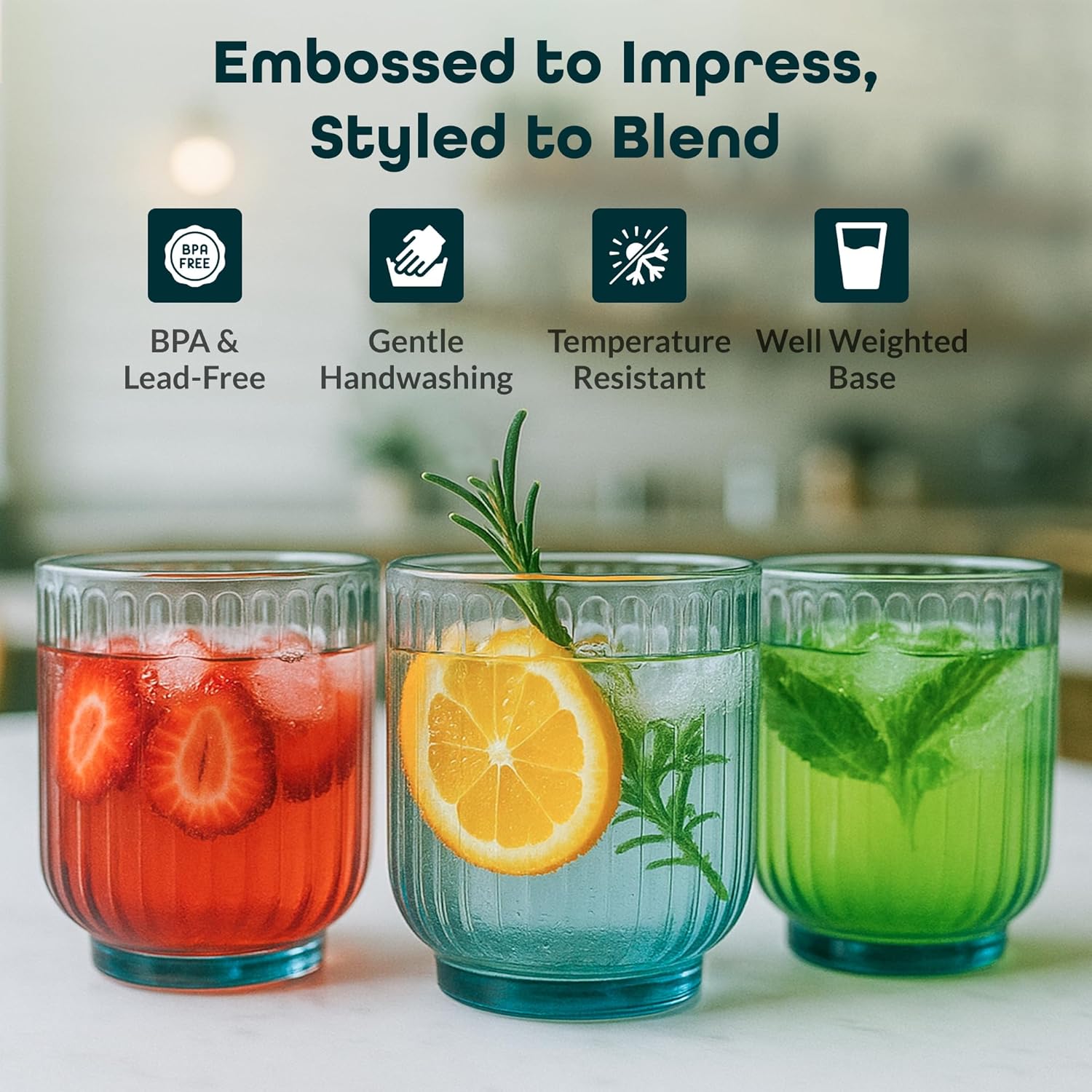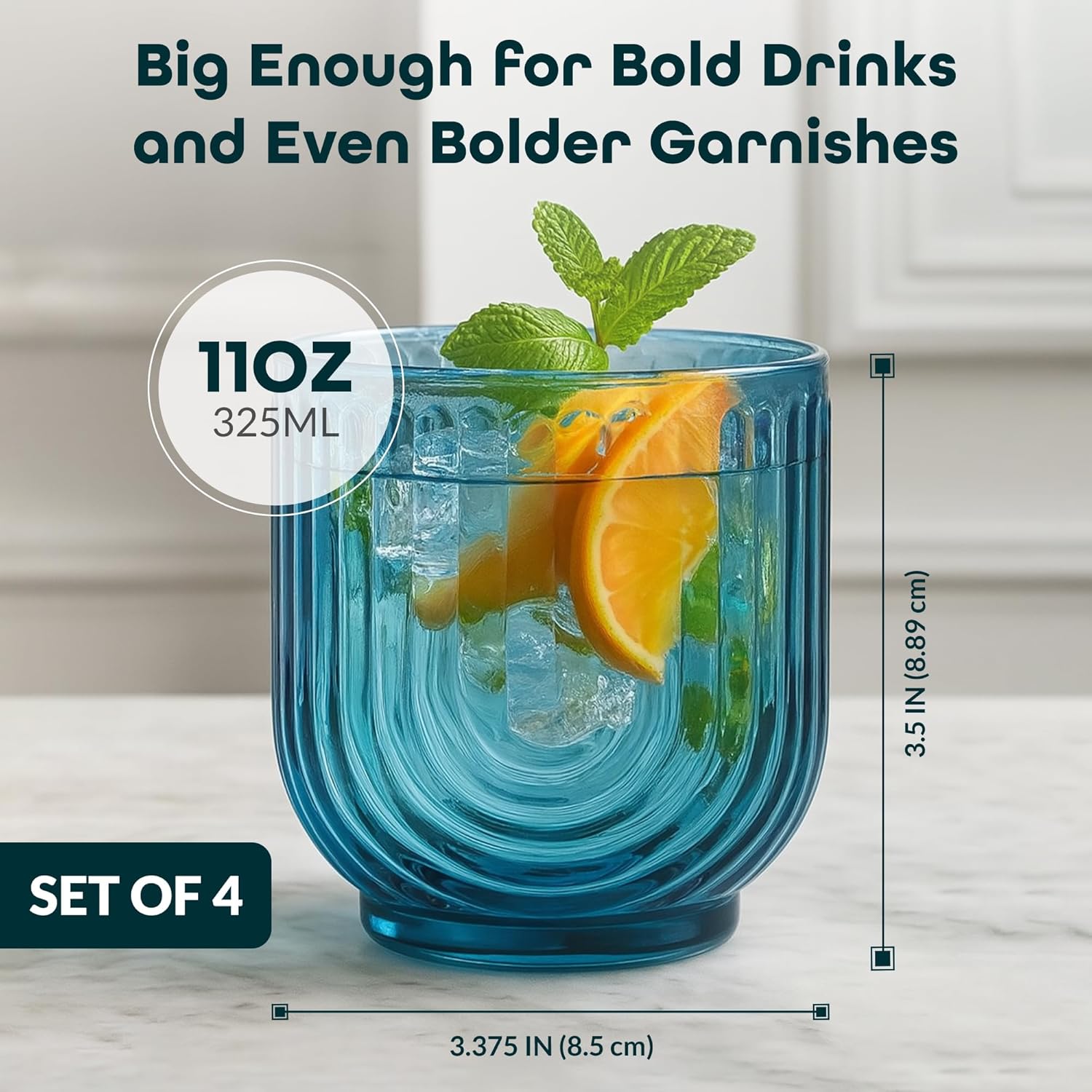 - 💪HIGH QUALITY: 4 matching blue drinking glasses, each with an 11-ounce capacity (325 ml), Glasses are designed with rippled thick glass, super sturdy, and well-weighted. Not too heavy, nor too light. Fancy, yet basic set. Our Glasses are BPA-free and lead-free. Just make sure to handwash this colored glassware in order to preserve its precious color.