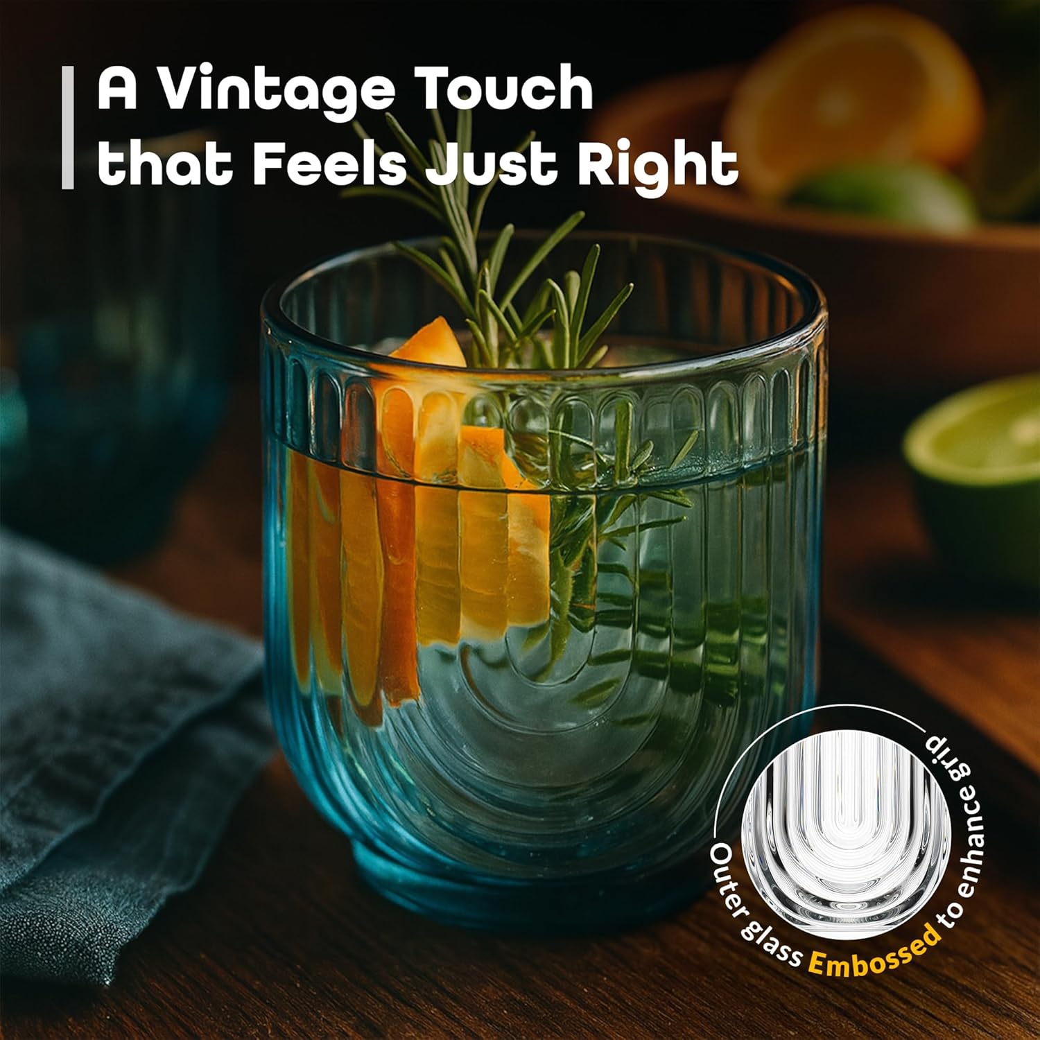 - 💙VINTAGE DESIGN: Beautiful Art Deco-inspired U-shaped pattern adds elegant texture to these sophisticated double old-fashioned glasses perfect for a variety of drinks, including whiskey, bourbon, scotch, mixed drinks, cocktails, beer, wine, margaritas, iced tea, coffee, smoothies, and everyday beverages. These drinking glasses work for both casual dinners and elegant parties, making them a perfect addition to your vintage or modern drinkware collection.