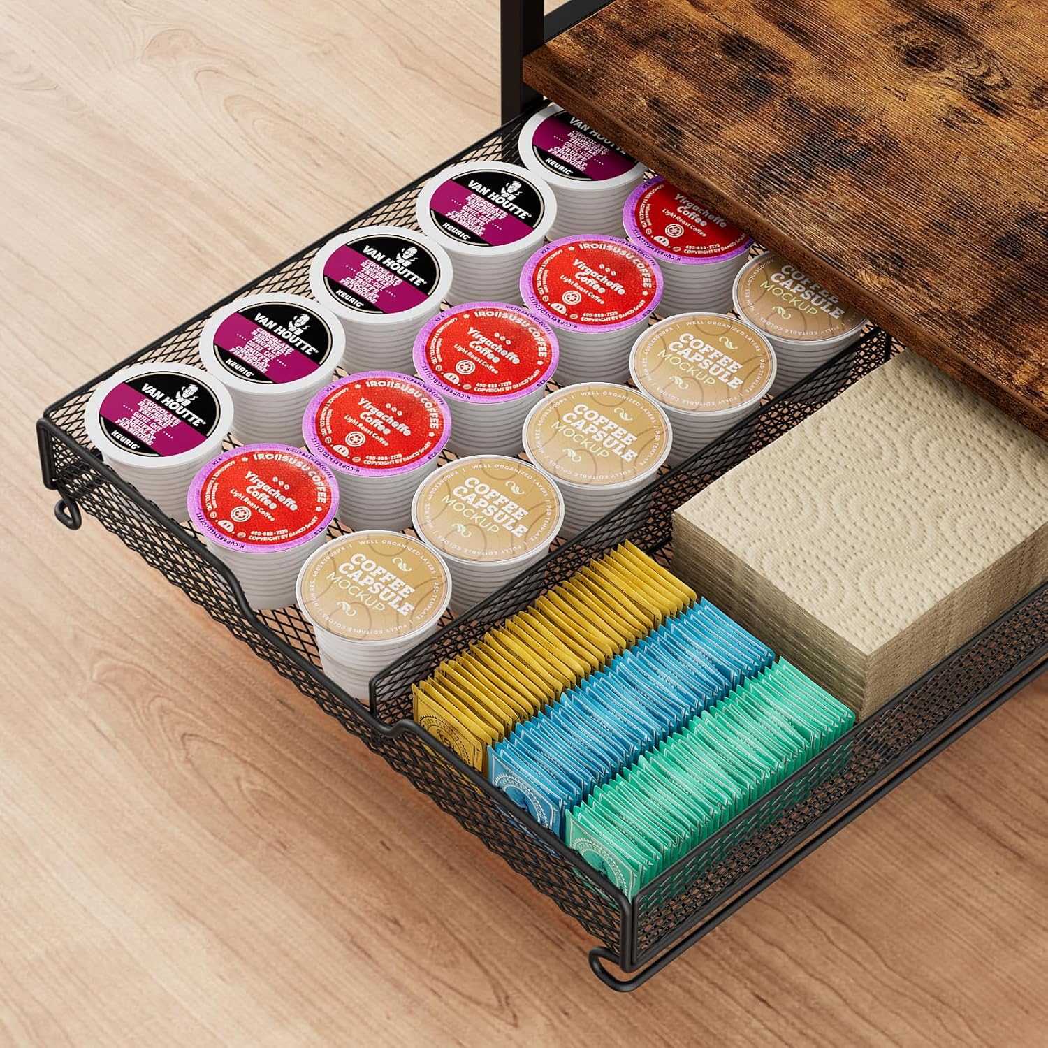 - 【3-Tier Larege Storage Space】The coffee station organizer with 3-tier design has a large capacity. The top layer with three sides of the baffle can prevent items from falling, the second layer of the display shelf can easily store and access to all the coffee set, and the bottom of the sliding drawer can place 30 K-Cup coffee capsules. It is the perfect combination of mug holders, coffee bar organizers, and coffee pod drawer, maximizing the space saving!