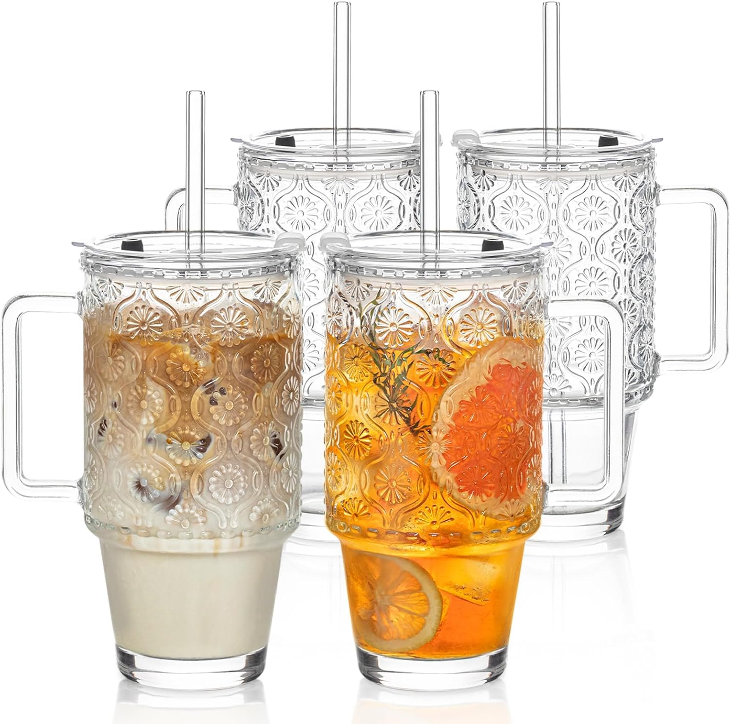 KEMORELA 4-Pack 24 Oz Glass Tumblers with Straws and Lids, Iced Coffee Cups with Begonia Floral Pattern, Smoothie Cups with Handles, Reusable Cold Drinkware, Glass Tumblers for Beverages