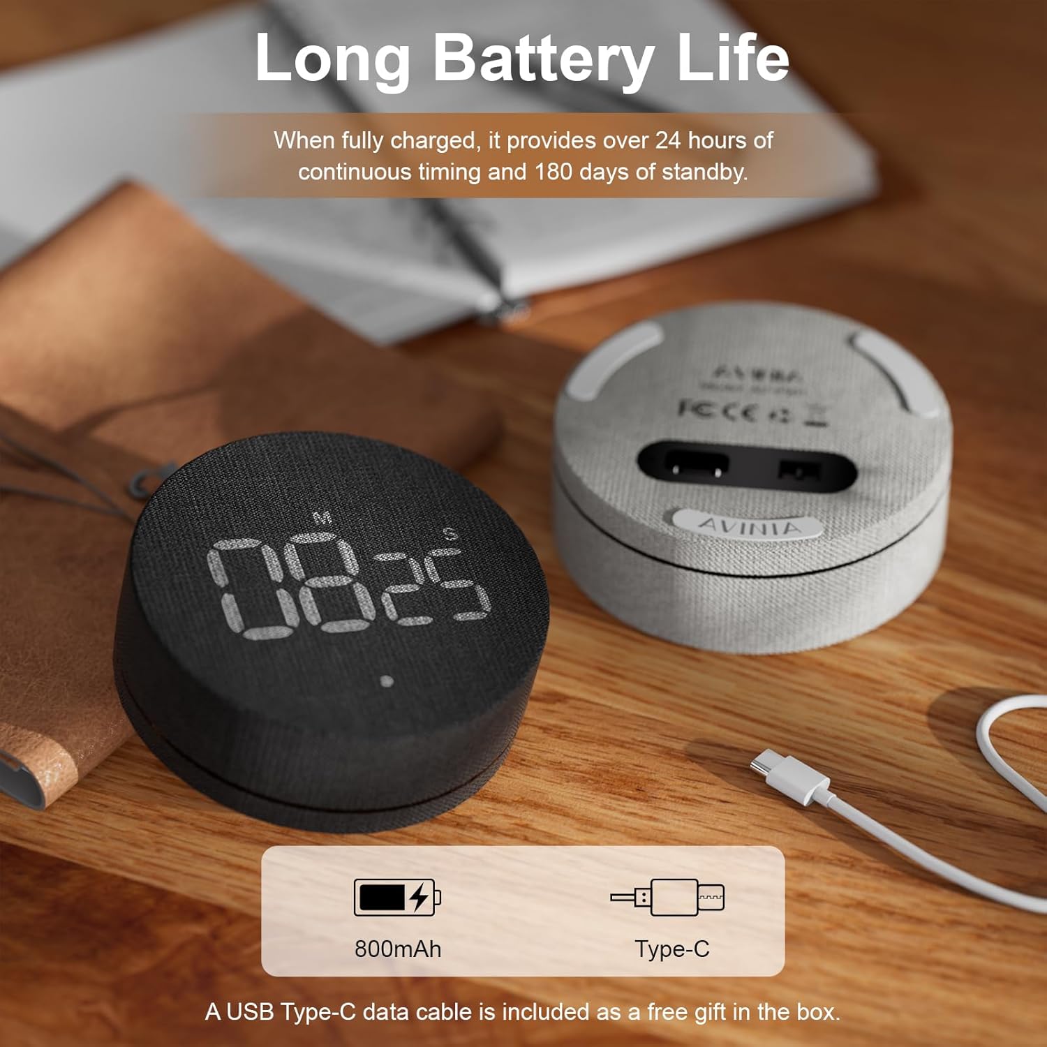 AVINIA Fabric Digital Kitchen Timer, Rechargeable with Large LED Display 0-99Mins, Magnetic Countdown Timers for Home Classroom Office Fitness Grey