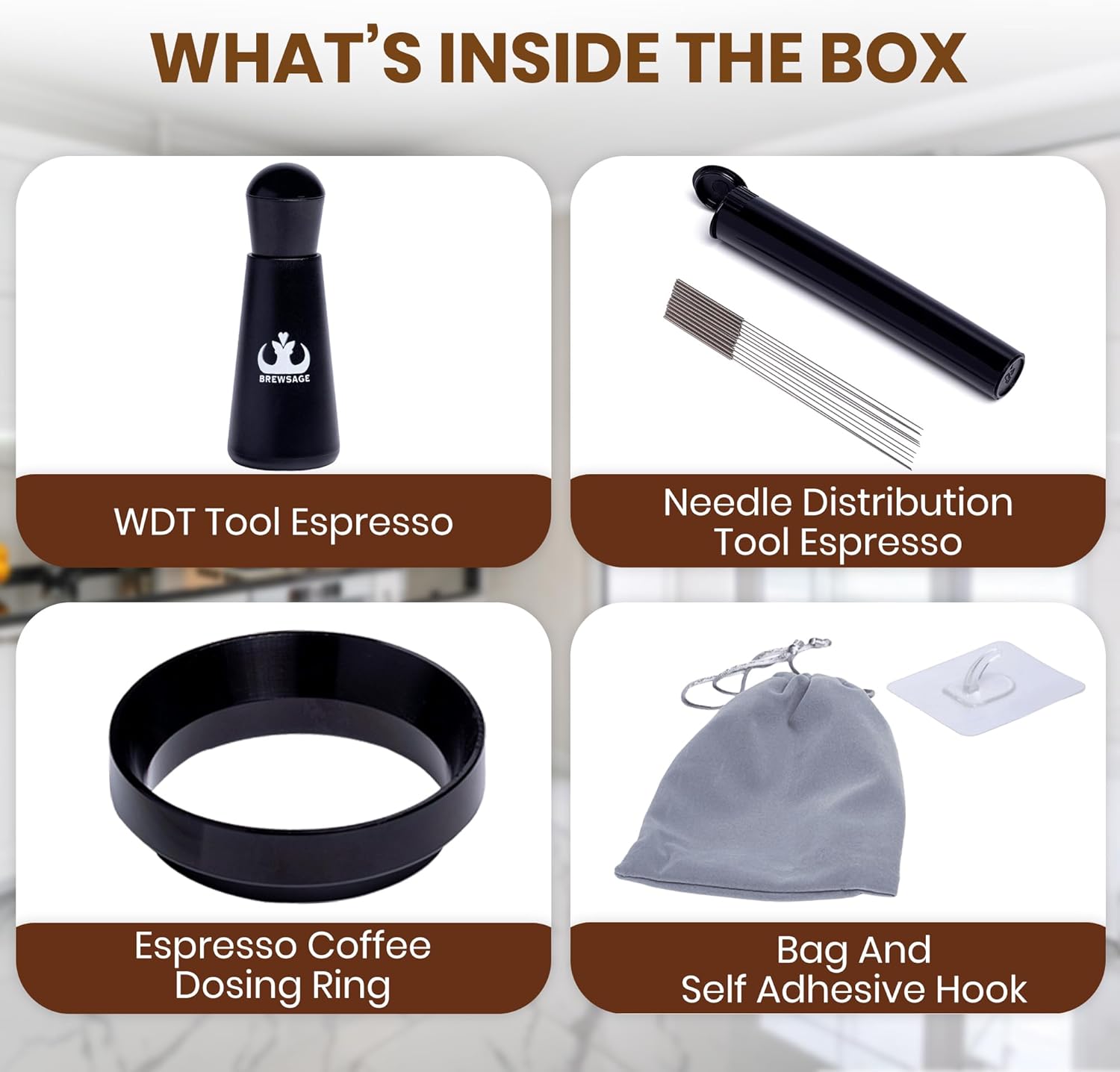 - ✅ 🧰 Professional-grade espresso distribution tool and tamper kit. Everything you need to upgrade your espresso workflow. Includes a precision WDT tool, a 58mm espresso dosing funnel, extra replaceable needles, a wall mount hook for storage, and a soft cloth pouch to keep your setup clean and organized—whether at home or on the go.