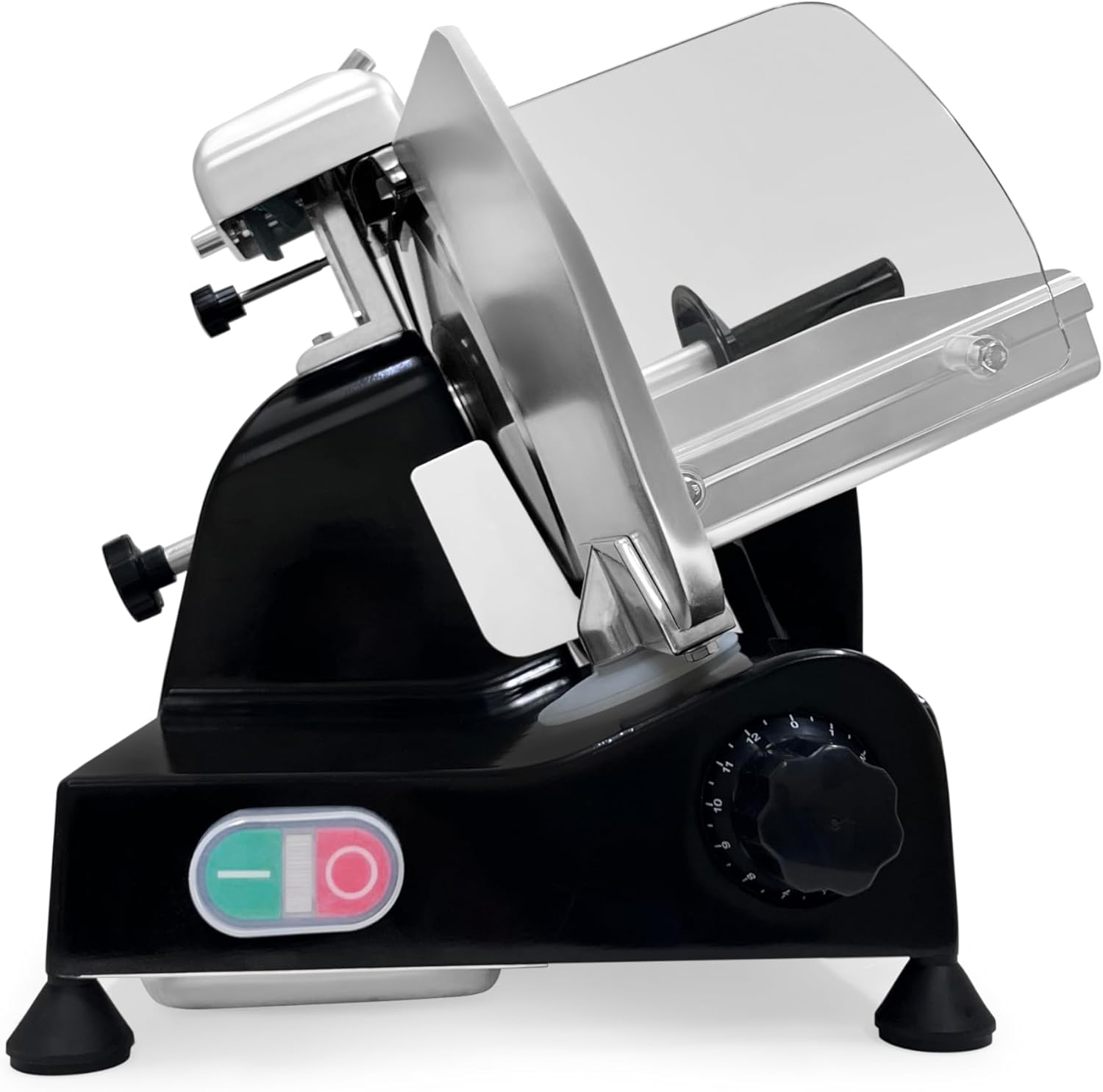 - Thickness Adjustment Control: The slicer features a thickness adjustment control that allows for precise slicing control. With a range from deli-thin to 0.4" (0–10mm), you can easily adjust the thickness of your slices to suit your preferences. This feature ensures precise and uniform cuts, making it perfect for slicing meats, vegetables, cheeses.