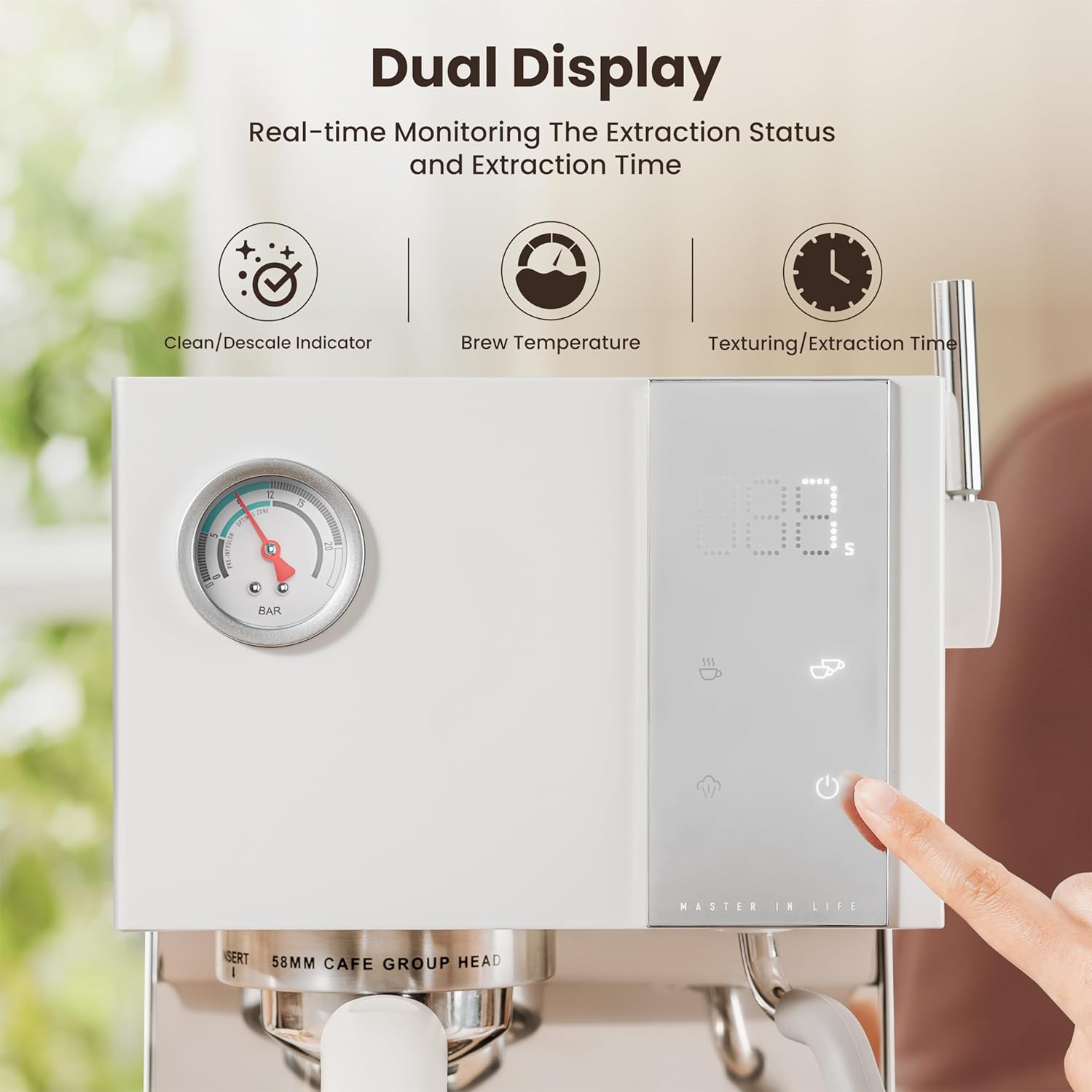 - 𝐃𝐮𝐚𝐥 𝐃𝐢𝐬𝐩𝐥𝐚𝐲 𝐑𝐞𝐚𝐥-𝐓𝐢𝐦𝐞 𝐌𝐨𝐧𝐢𝐭𝐨𝐫𝐢𝐧𝐠: The Gevi espresso machine features an intuitive touch control panel that makes it easy to customize your brewing settings. Equipped with an extraction pressure gauge and digital display screen, it allows real-time monitoring of extraction pressure, time, and temperature, making the coffee-making process more intuitive.