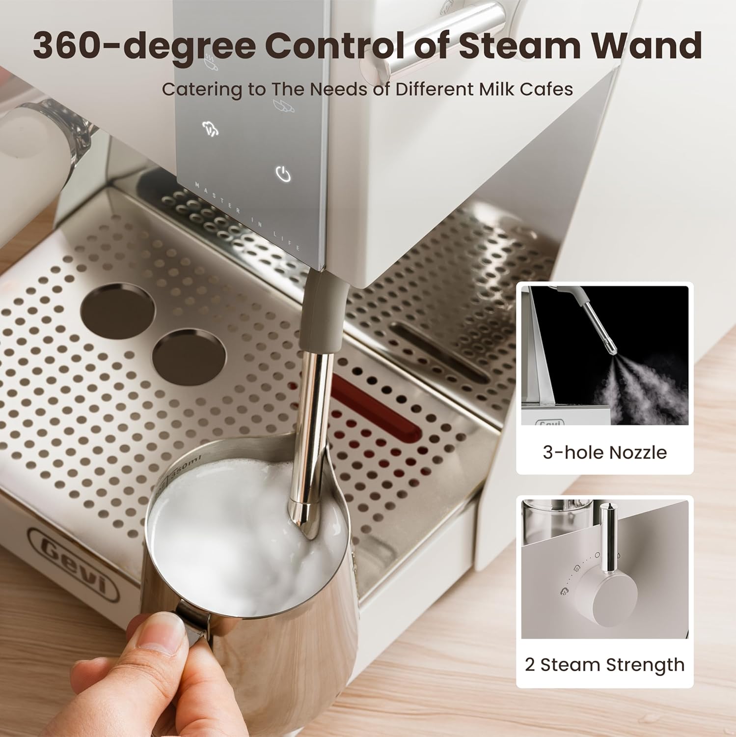 - 𝐌𝐢𝐜𝐫𝐨𝐟𝐨𝐚𝐦 𝐌𝐢𝐥𝐤 𝐓𝐞𝐱𝐭𝐮𝐫𝐞: The semi-automatic steam wand is equipped with a three-hole nozzle, providing two steam options (Mild Mode and Strong Mode). Easily create barista-level microfoam for latte and cappuccino art.