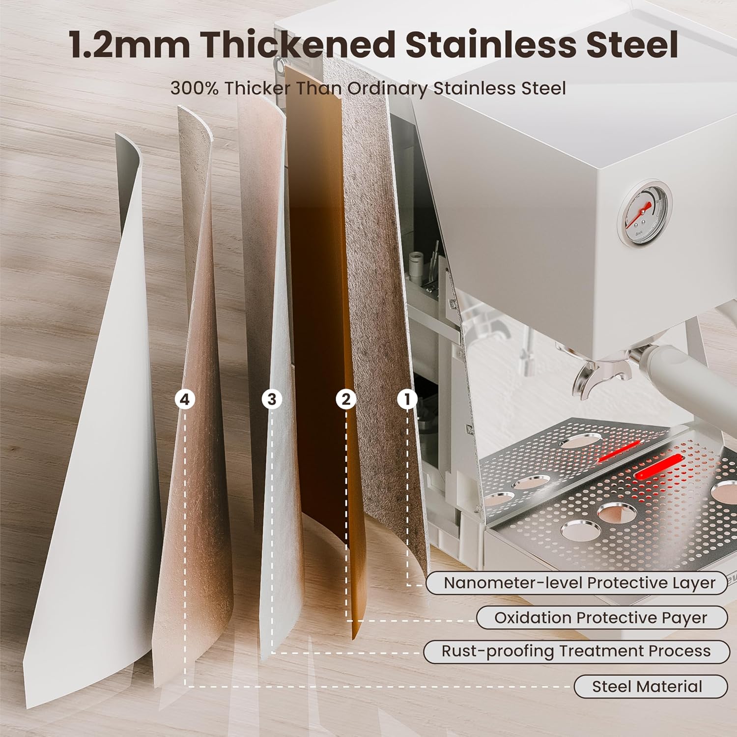 - 𝐓𝐡𝐢𝐜𝐤𝐞𝐧𝐞𝐝 𝐒𝐭𝐚𝐢𝐧𝐥𝐞𝐬𝐬 𝐒𝐭𝐞𝐞𝐥 𝐇𝐨𝐮𝐬𝐢𝐧𝐠: This espresso machine features a thickened stainless steel exterior, which is 300% thicker than ordinary stainless steel materials. Featuring four layers: the Steel Material, Rust-proofing Treatment Process, Oxidation Protective Layer, and Nanoscale Protective Layer. Making it more durable and longer-lasting, and also easier to clean.