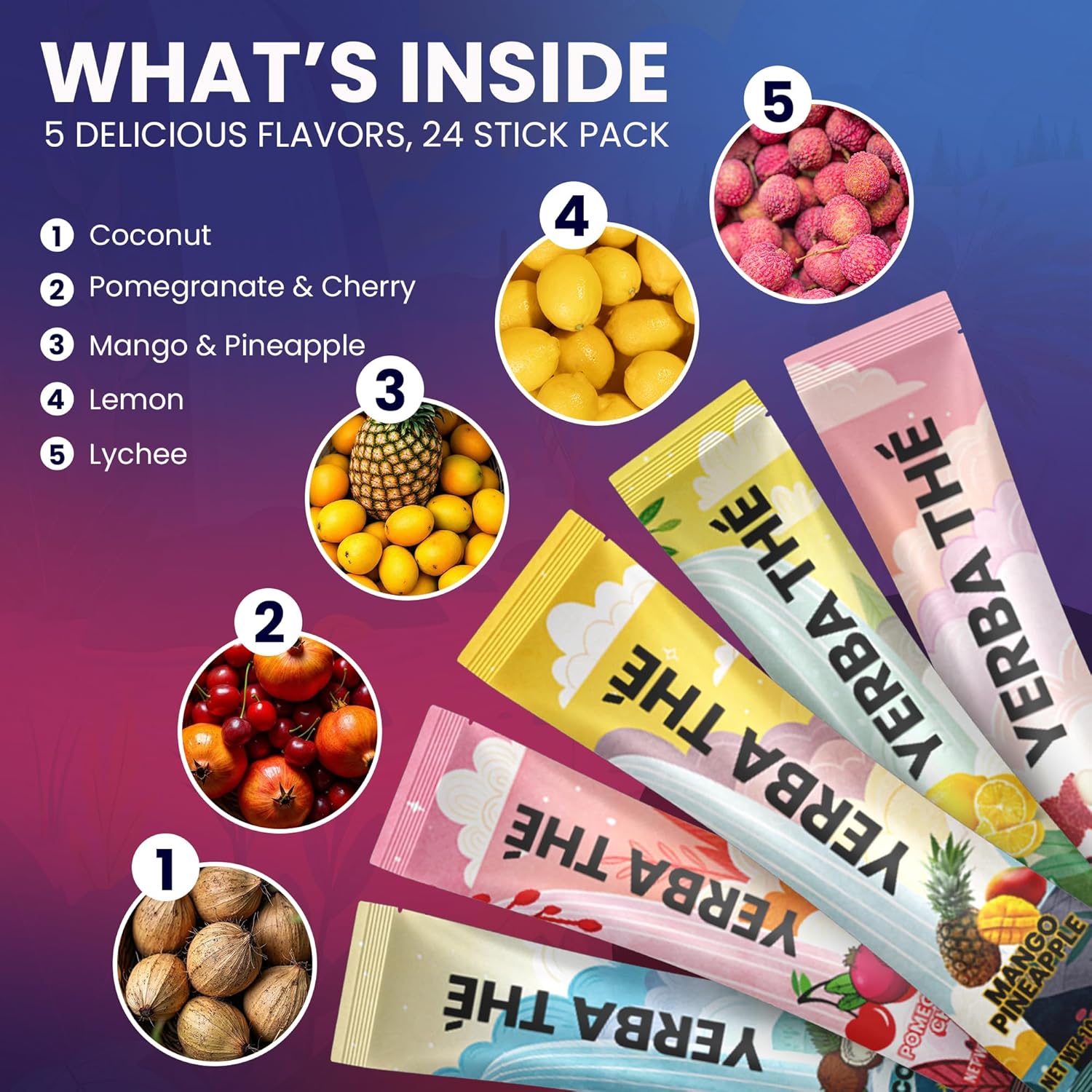 Yerba Mate Tea Powder 5 Mixed Tropical Fruit Flavors Clean Energy Drink Superfood - Support Gut Health, Probiotics and Prebiotics, Reduce Brain Fog, Relaxation & Focus Blend 30 sachets