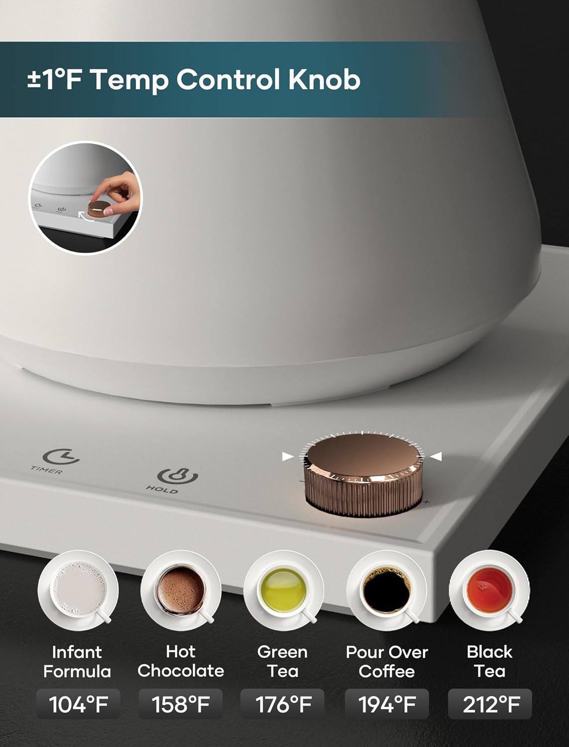 - ±1℉ Temperature Accuracy - The intelligent base's built-in temperature control program. The program will adjust the heating power when the water temp approaches the desired temp according the temp probe detects the temp change.