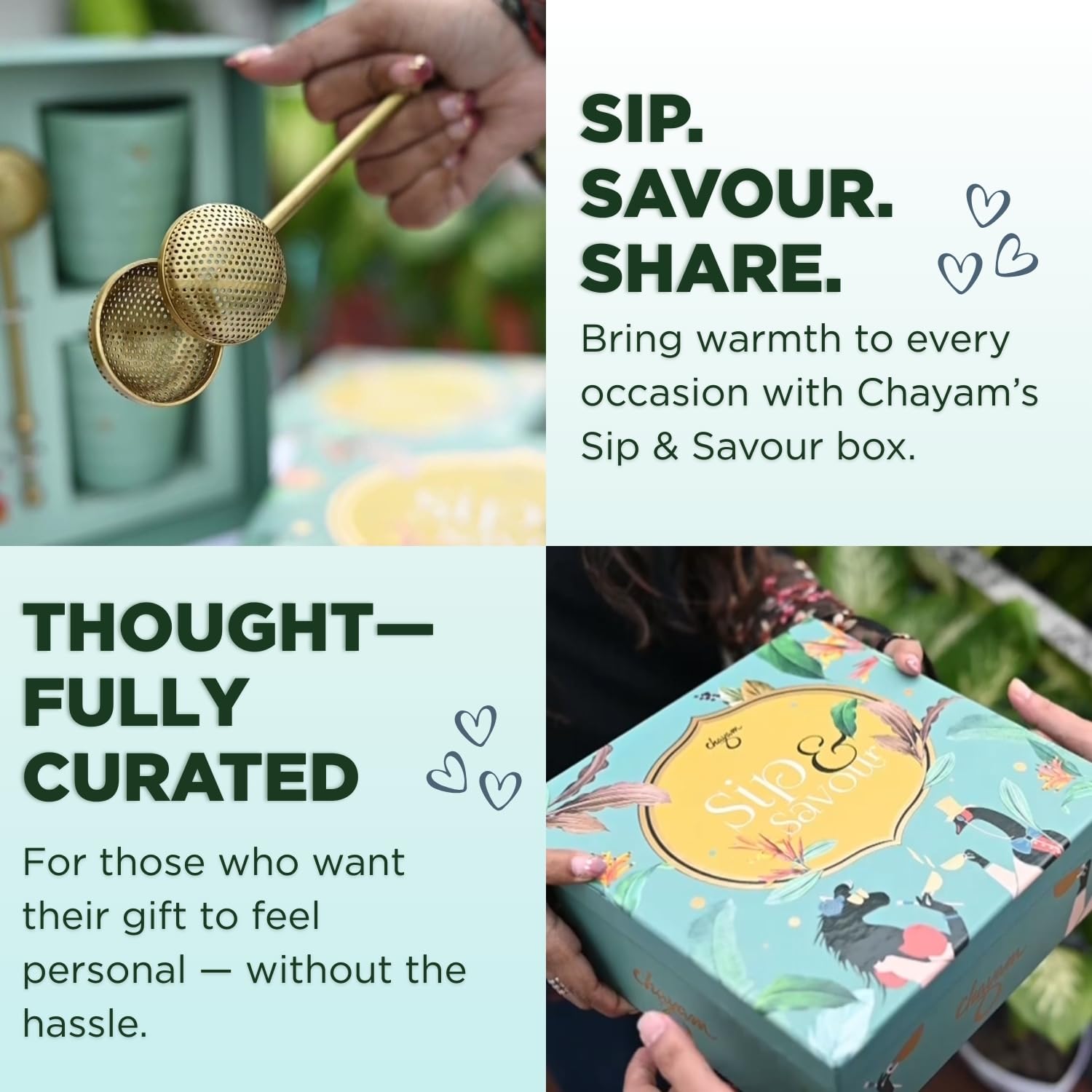 - THE ULTIMATE GIFT SOLUTION: Elevate corporate gifting with SIP AND SAVOUR - a premium collection featuring 10 Pyramid Tea Bags, a Tin Caddie of Freshly Blended Loose Tea, a Stylish Brass Infuser, and Exquisite Gold-Embossed Kulhads - perfect for impressing clients and colleagues.
