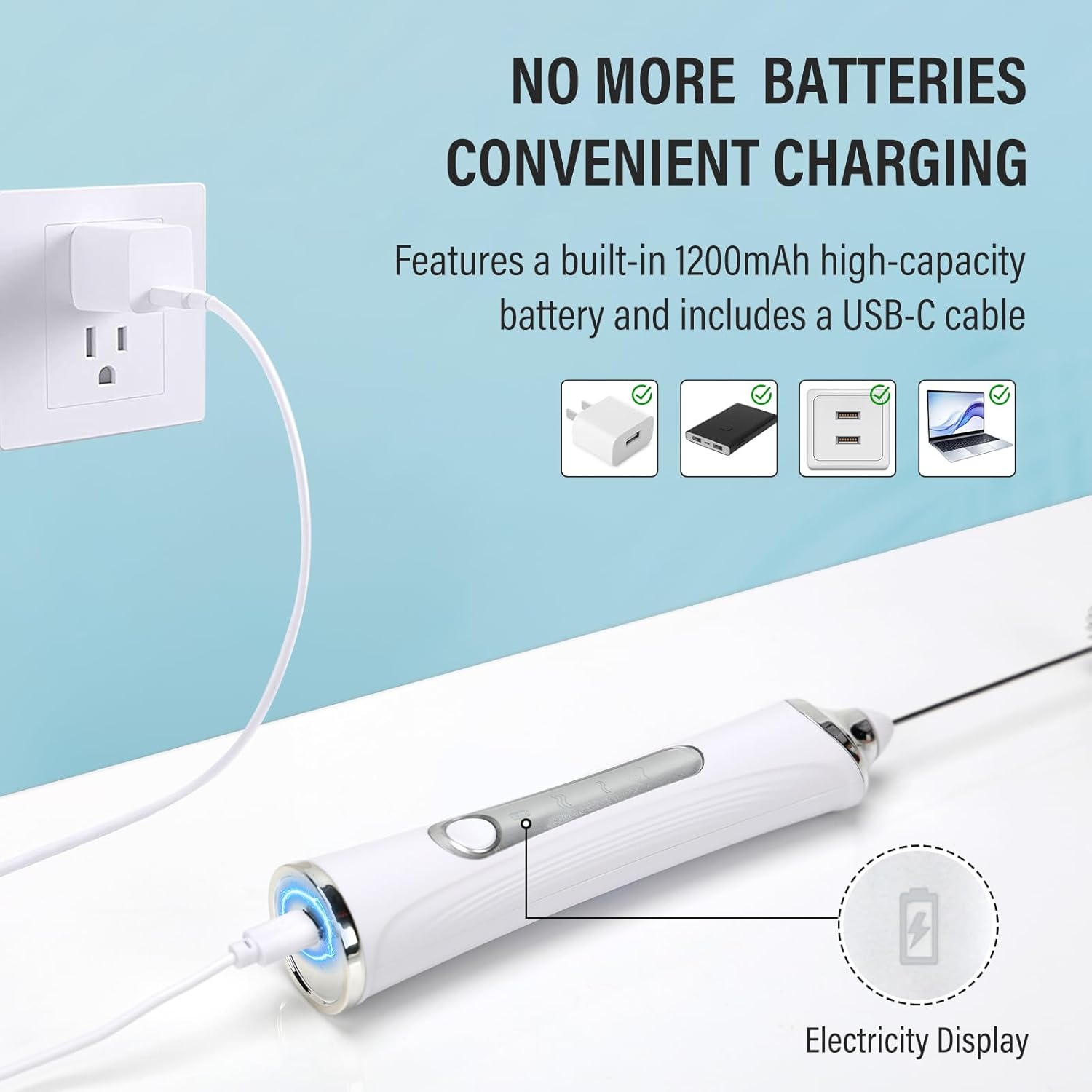 - USB-C Rechargeable Milk Frother: Unlike traditional battery-powered milk frothers, this rechargeable model features a 1200mAh lithium battery—eliminating the hassle of frequent battery replacements,Our rechargeable milk frother can be used for several months after being fully charged, each time.Our stirrers electric can easily make creamy foam for coffee and mix drinks noiselessly in 15-20 seconds, allowing you to enjoy silky drinks immediately