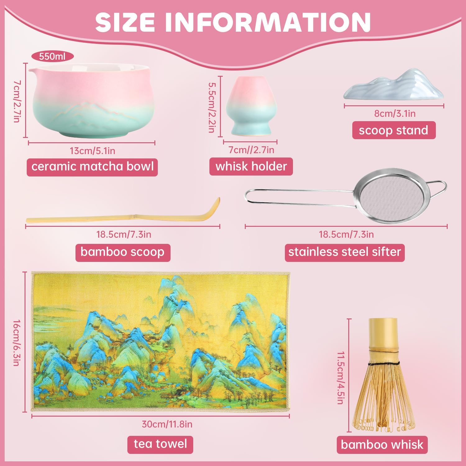 - Complete Matcha Whisk Set: This matcha kit includes everything you need for an authentic matcha experience: 1* bamboo matcha whisk, 1* bamboo scoop, 1* scoop stand, 1* stainless steel sifter, 1* 18.6 oz/550 ml ceramic matcha bowl (Chawan), 1* whisk holder, 1* tea towel, and 1* user manual