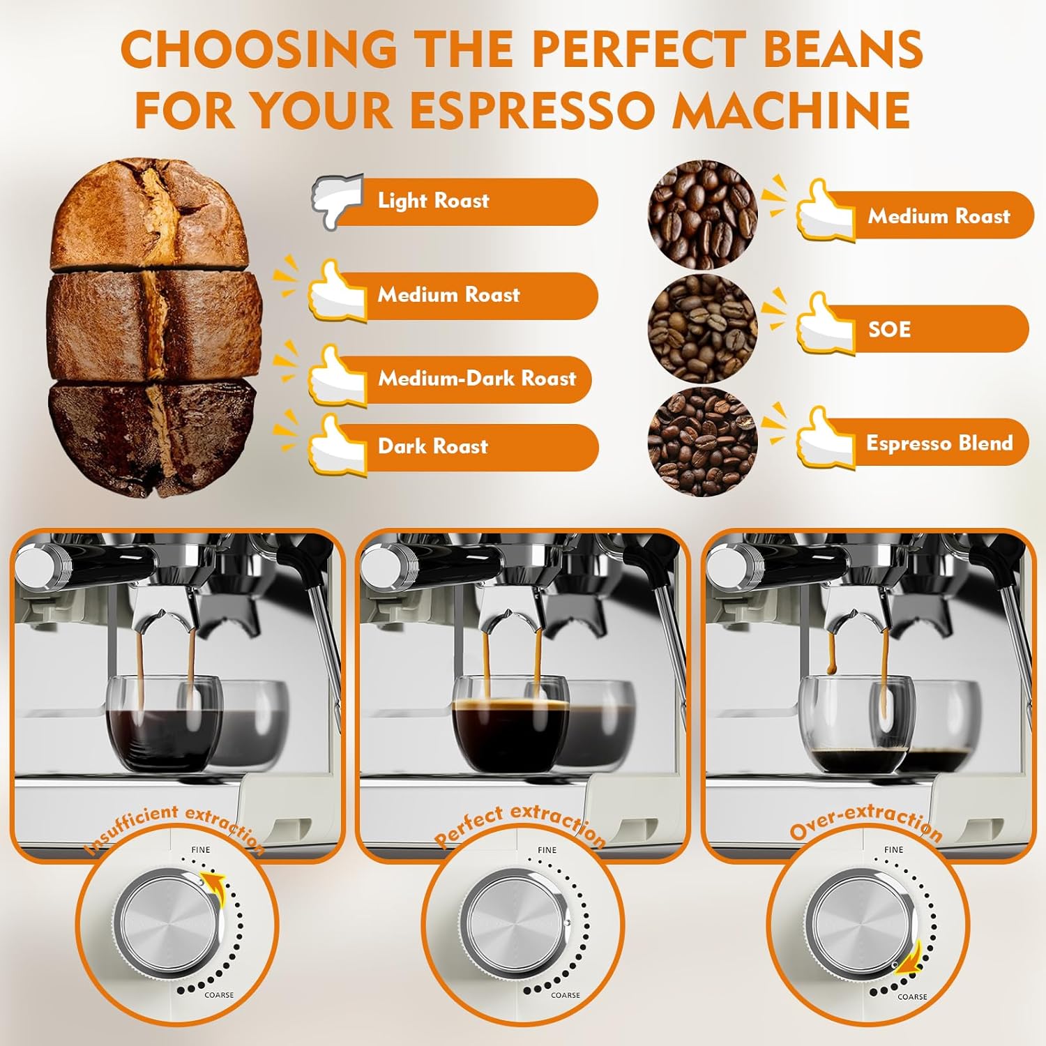 - Dose Control Espresso Machine: Pre-set dosing technology delivers exact coffee grounds per cup (single/double shots). Coffee Beans: 12-14g for one shot; 18-20g for double shots. Brewing Espresso: One shot is about 30ml; Double shot is about 60ml