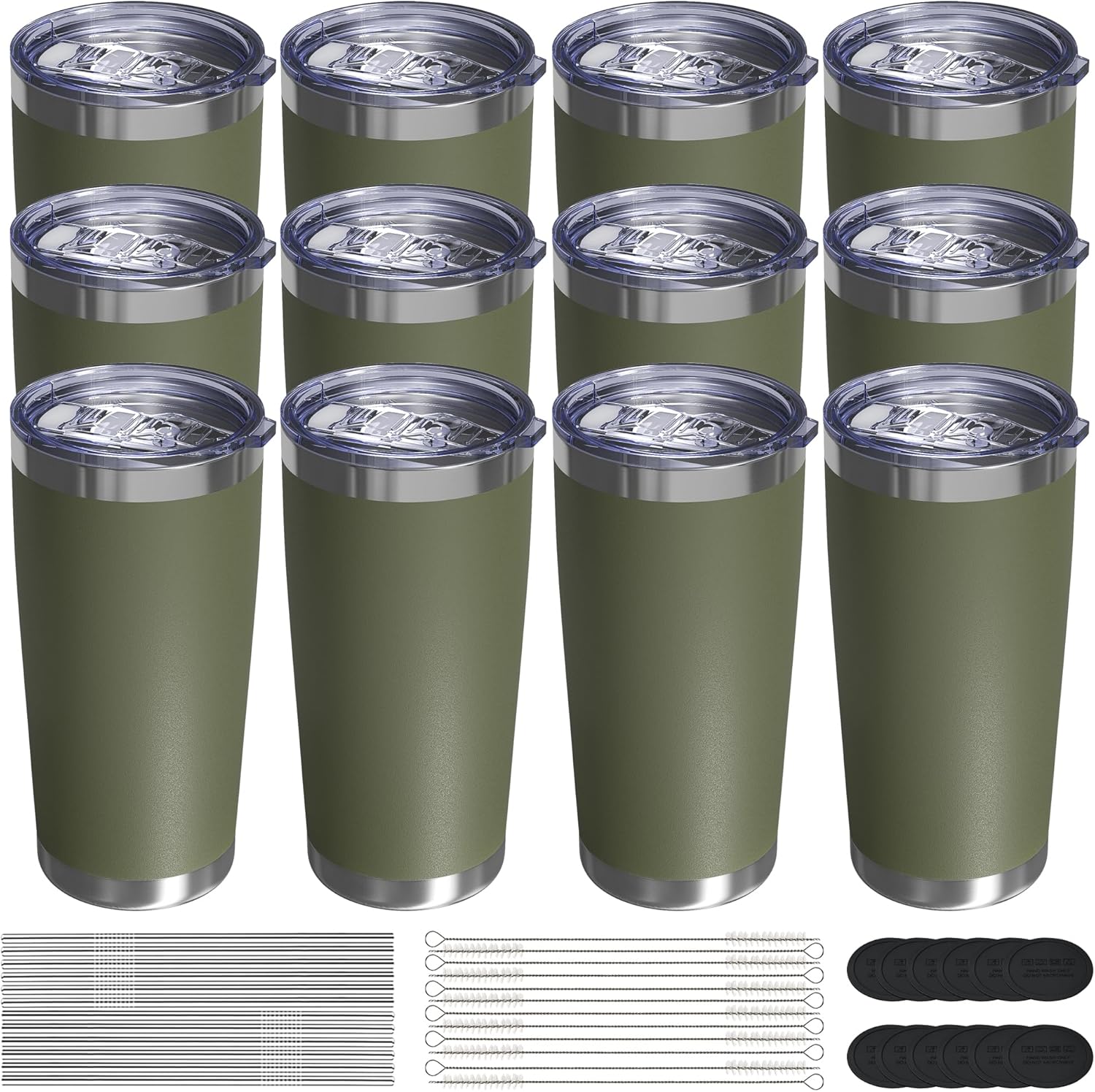 Travel Coffee Tumbler 20oz, 12 Pack Leakproof Travel Coffee Mug with Lid and Straw, Stainless Steel Double Wall Vacuum Insulated Tumbler for Hot/Iced Drinks (Textured Matte, Army Green)