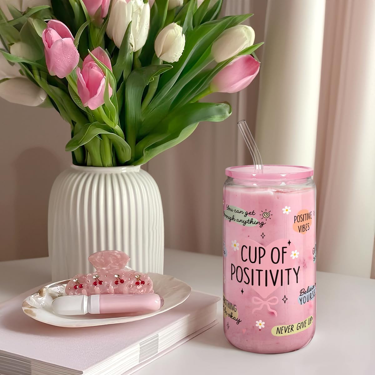 SANDJEST Inspiration Gifts - Glass Tumbler 16oz with Acrylic Lid and Straw - Iced Coffee Cups for Women, Aesthetic Glass Cup Gift for Birthday Christmas