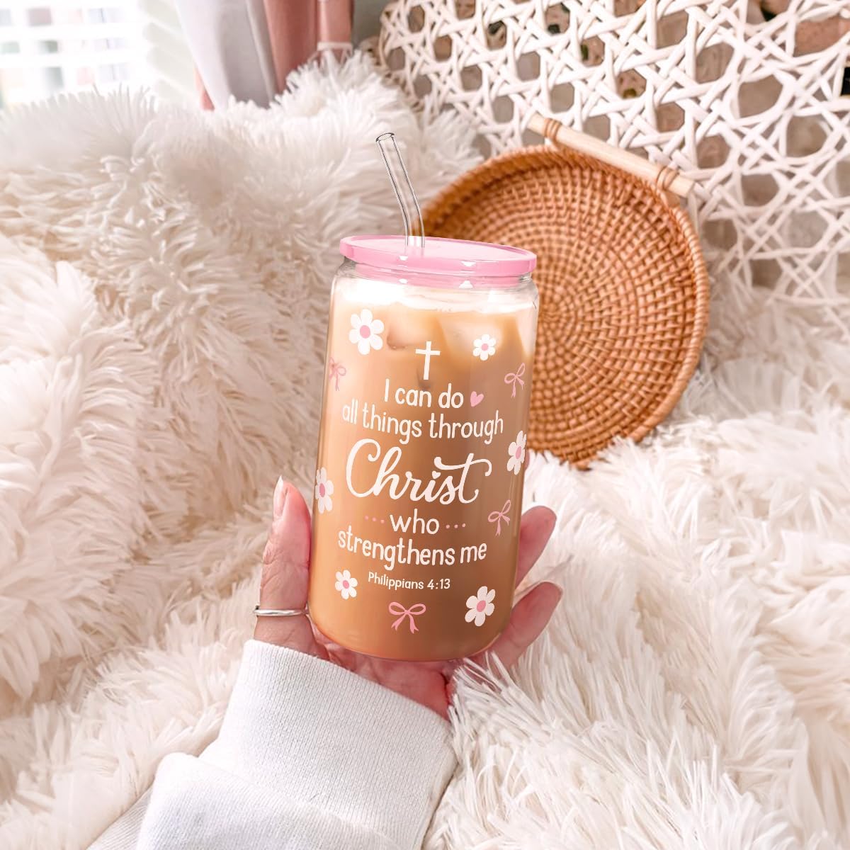 SANDJEST Christian Glass Can Tumbler 16oz, Inspirational Glass Cup with Lid & Straw, Iced Coffee Aesthetic Cups for Women Girls, Gifts Idea for Christmas Birthday