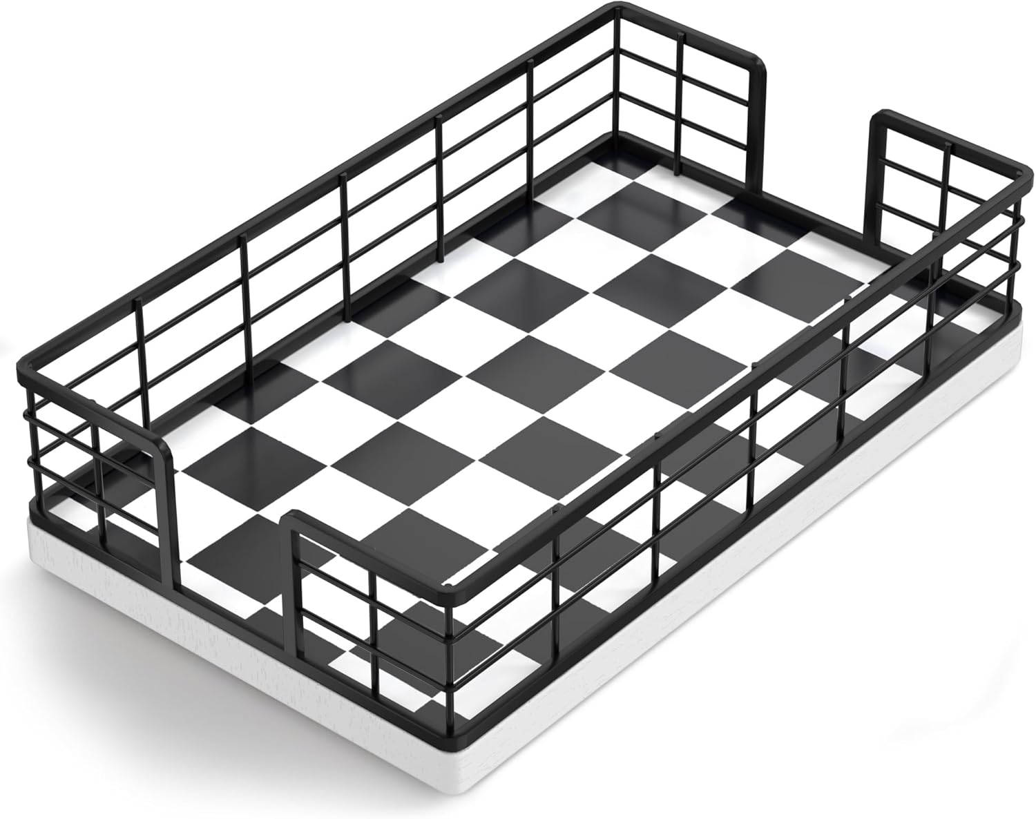Wican Guest Towel Holder Tray for Bathroom, Oak and Iron Napkins Holder for Powder Room Dinning Table Wooden Basket for Disposable Paper Hand Towels Black and White